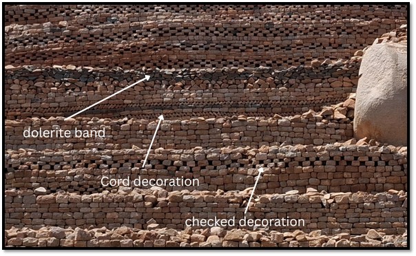 The imposing tiers of decorated dry-stone walling indicate the front of the main Torwa residence and are the most photographed image of Khami. The open area in front may have been the royal court with a small platform on the east that may have been from where the ruler presided.