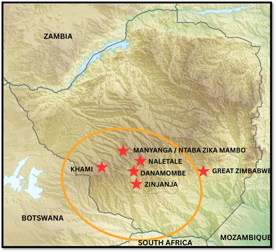 Within the wider southern African region, archaeologists suggest that Zimbabwe Culture first emerged at Mapela, then Mapungubwe in 1220 – 1300 AD, relocated to Great Zimbabwe (peaked 1200 – 1300 AD, declined 1400’s, abandoned 1500’s) followed by Khami’s emergence around 1400 AD. It is conceivable that around 1250 AD some of the Leopard’s Kopje communities in south-western Zimbabwe developed into Khami, there are pottery similarities. Between 1425 and 1685, Khami was the capital of the Torwa state, which was succeeded by Danamombe, the centre of the Rozvi-Changamire dynasty that ruled from multiple capitals from 1685 to 1839.