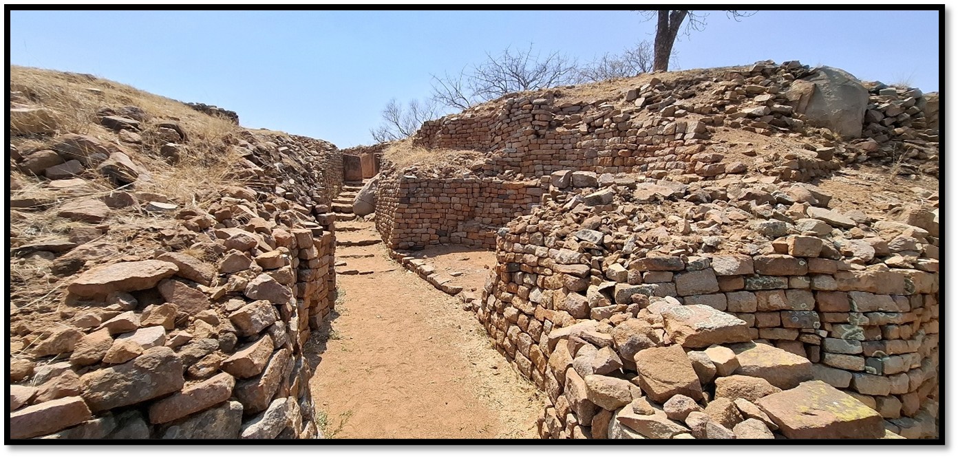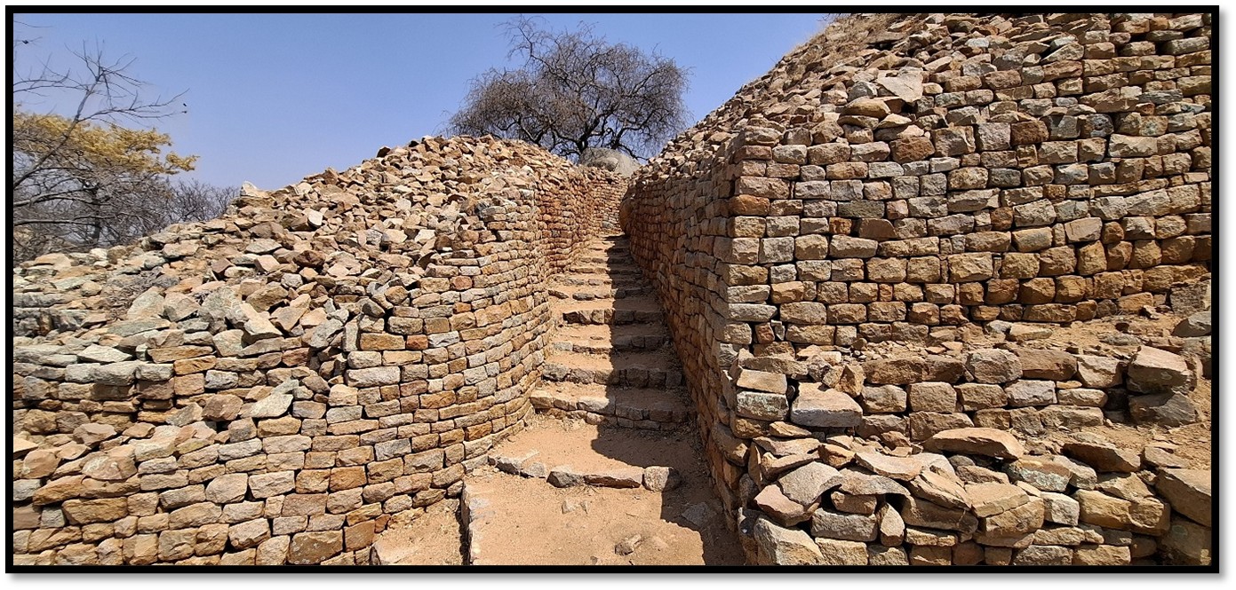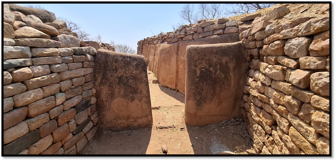 From the base the main entrance leads via a sunken passageway to the summit of the platform. An alcove on the right was probably for royal guards. The replacement stone steps are on top of the original stone and dhaka steps and the sunken passageway probably originally has a thatched grass roof. Some of the wooden mopane posts placed in wall niches were present in the 1890’s.