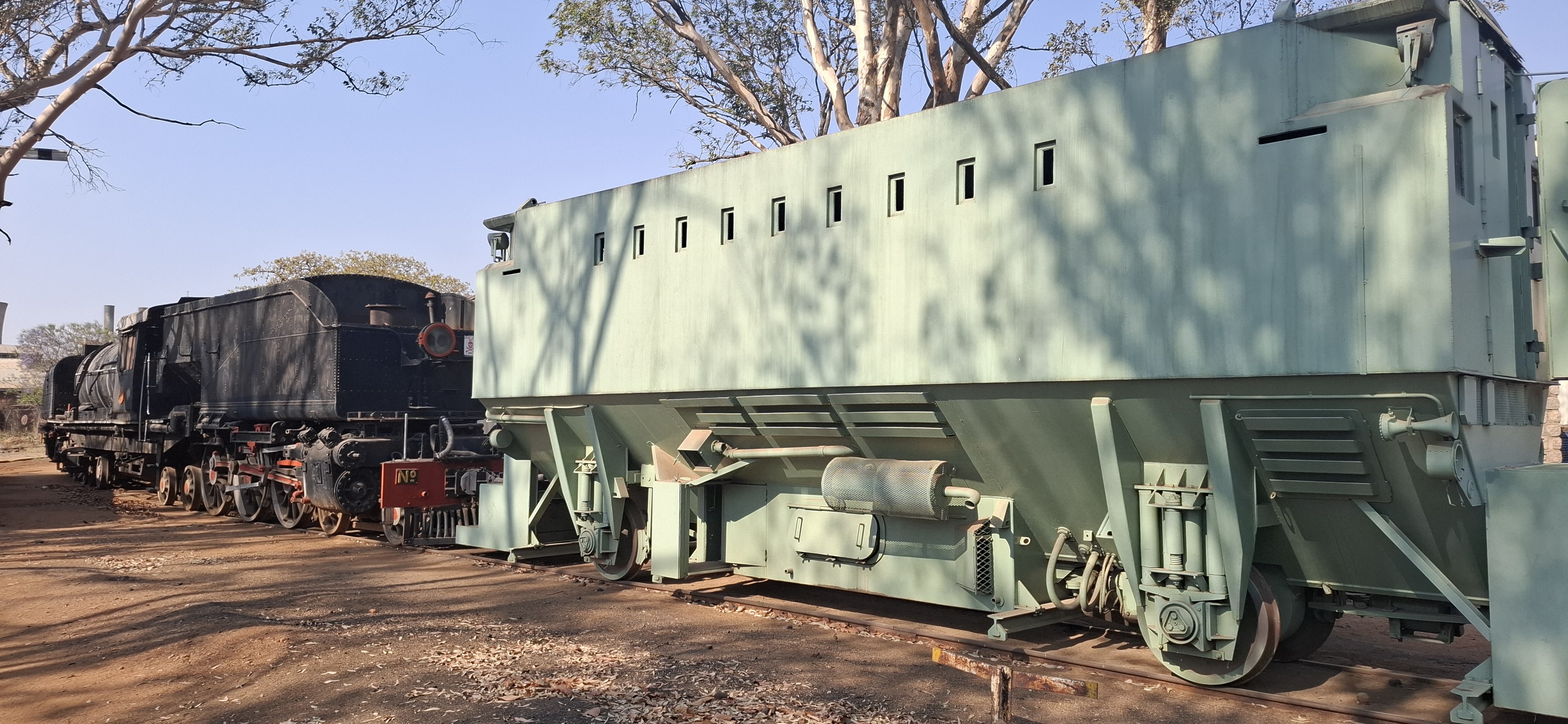 Built locally in the late 1970's and capable of carrying 35 police, railway security or soldiers and powered by a Leyland 680 diesel engine. Intended as an armoured escort vehicle for passenger trains the armour proved too heavy for the engine and it was rarely used. Used once again in Mozmbique's civil war it was found underpowered again and unsuitable. Discarded and parked at the Bulawayo railway workshops, it was donated to the Museum and has been partially restored. Here seen hitched to a Garrett Locomotive No 411