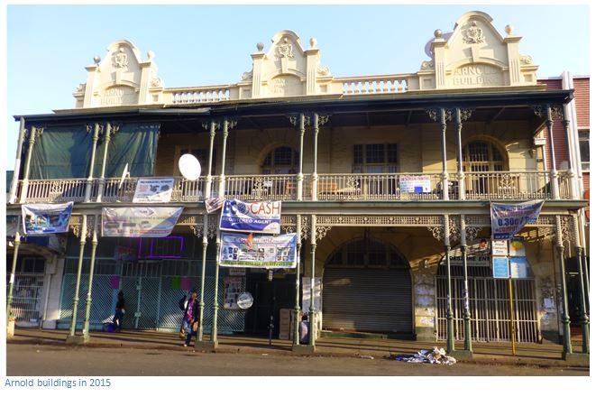 The middle gable contains the completion date “Anno Domini MCMX.” Arnold had the property built for his own use as auctioneers rooms (left below) and two shop units (right below) on the ground floor and his personal rooms on the first floor. The main feature is the ornate double-storey balcony verandah on the front with its ornate ironwork of six columns on each floor made by Wade and Dorman of Durban.