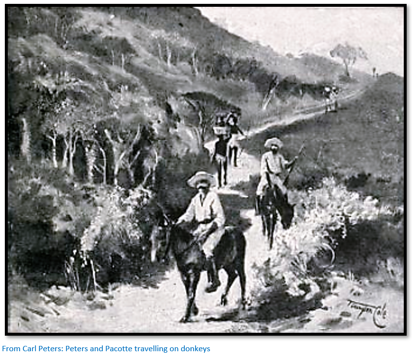 Mr Pacotte, the assayer and inspector of mines of the Mozambique Company takes a week’s leave to show Peters the Manica mining district which is north of the town of Macequece. On 10 January 1901 they leave by donkey across the Revue valley with the road winding upwards in mighty zig-zags and only reach their camp after nightfall.