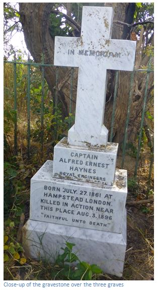 Captain Haynes marble memorial is surrounded by a still intact metal railing. The epitaph reads: IN MEMORIAM. CAPTAIN ALFRED ERNEST HAYNES, ROYAL ENGINEERS. BORN JULY 27 AT HAMPSTEAD LONDON. KILLED IN ACTION NEAR THIS PLACE AUG 3 1896. “FAITHFUL UNTO DEATH”