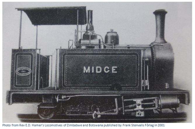 Two of the five locomotives ordered in 1892 through Kerr Stuart of Kilmarnock, Scotland for the Beira and Mashonaland Railway were 0-4-2 side tanks of the Brush “Midge” pattern. The one shown below, thought to be No. 212, was named Rhodes and hauled the first construction train into Umtali on 4 February 1898. They were the very first locomotives to be used on the Beira line. No 212 eventually became a shunter at Umtali and No 213 did the same at Beira docks.