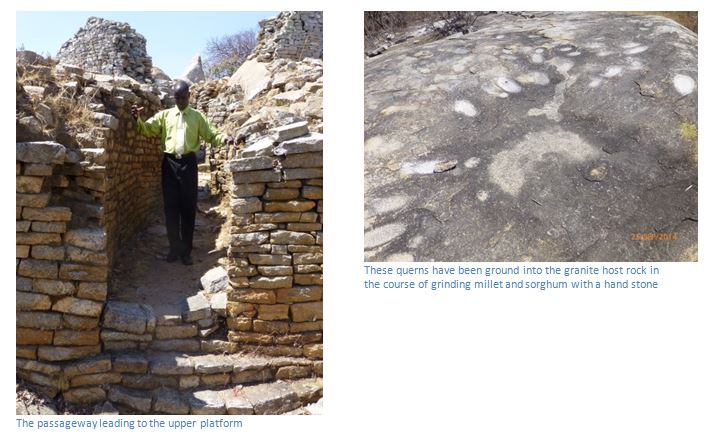 Mutoko ruins have been built amongst the rocks, as shown in the plan above by A. Whitty; it has three main platforms with a passage leading from the main entrance to the upper platforms, plus evidence of a chevron pattern in the walling all leading to the conclusion that the style is very reminiscent of Khame Type 4 ruins, although they are both at opposite extremes of Zimbabwe.