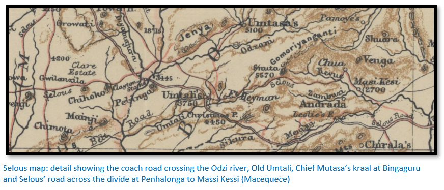 Then Selous cut the coach road from the Odzi river to Salisbury with Armstrong from February to May 1891 that is labelled “main road” above.