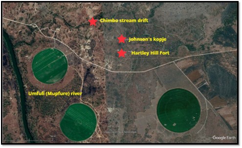 [29] The distance from Hartley Hill Fort to the Umfuli (Mupfure) river at its nearest point is 1,840 yards (1,680 metres) so clearly the Chimbo stream 470 yards (430 metres) away was their water source and must still have had pools of water in mid-winter.