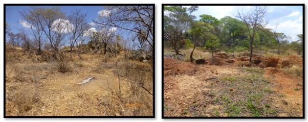 Author photos: (L) below the Hartley fort, hospital was on the flat ground on the left; Johnson’s kopje, artisanal gold mining in the foreground