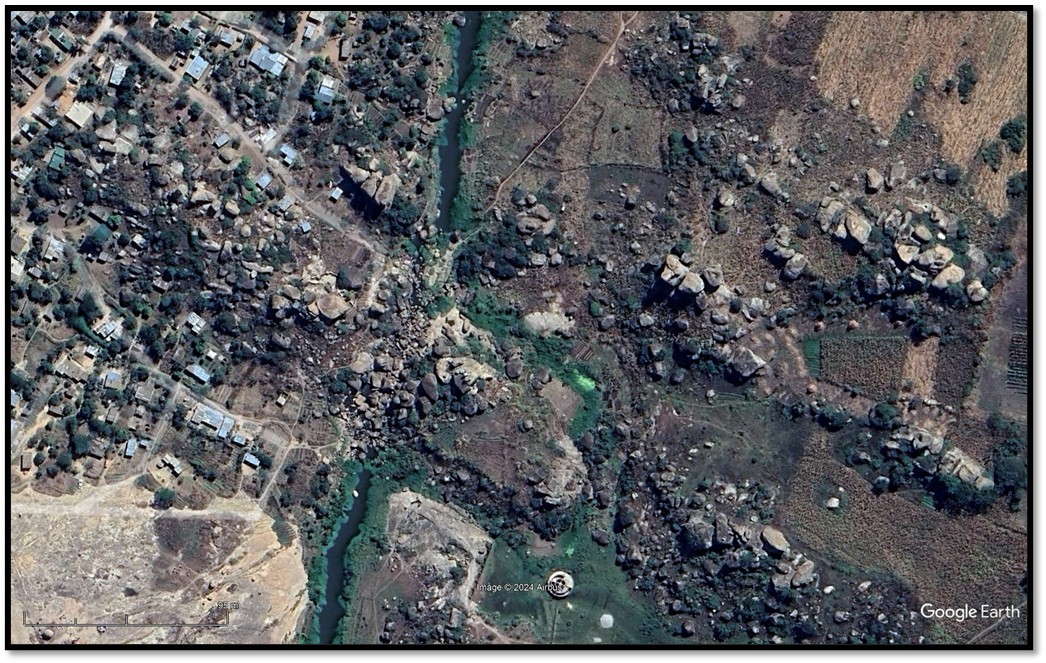 Google Earth Image: Headman Simbanoota’s kraal at GPS 17°55´7"S 31°10´19"E. This is 2.6 kms south of Garlake’s position for the kraal but still on the Ruwa river – the justification being that there are no granite kopjes at Garlake’s indicated site on his map