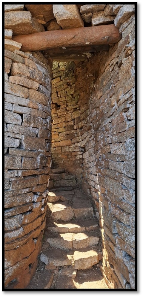 This original covered stairway leads from the Western Enclosure with stairs and a twist in it and is a remarkable example of the builder’s skill. Summers says it is the only original covered stairway at Great Zimbabwe.[11] It used to lead up to a platform with monoliths but was been walled off as dangerous. Theodore Bent saw three monoliths[12] on this platform and another monolith close by with geometric patterns that he removed and gave to the South African Museum in Cape Town.[13]