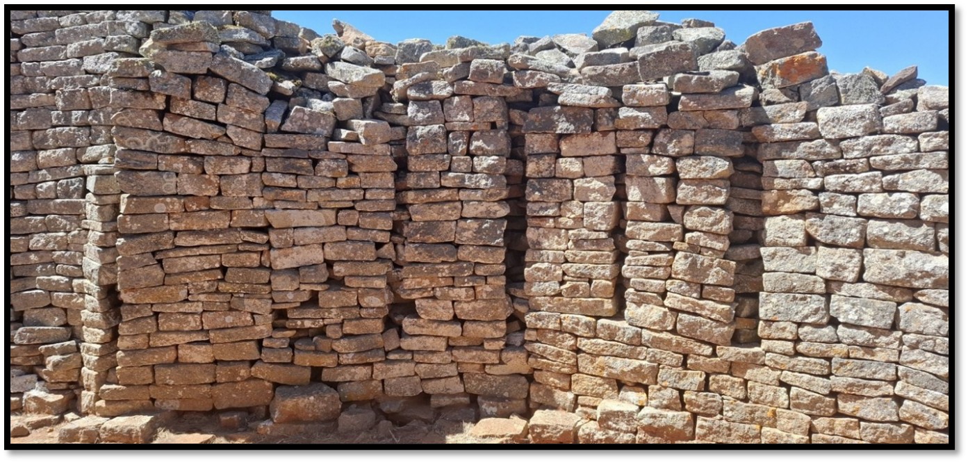 “These blocks therefore, were not only an extremely accessible material, they also lent themselves to building techniques based on more or less regular horizontal layers of stone. The Walls of Great Zimbabwe were built in exactly this way. Blocks were laid without any mortar to make walls from 1.2 – 5.2 metres (4 to 17 feet) thick whose height was about double their thickness. This method of construction produced inherently sound walls whose wide bases exerted an even and relatively small pressure on the ground, flexible enough to adjust to any subsidence that occurred, yet sufficiently wide in relation to their height to ensure their stability and whose slabs were not easily dislodged.”[4]