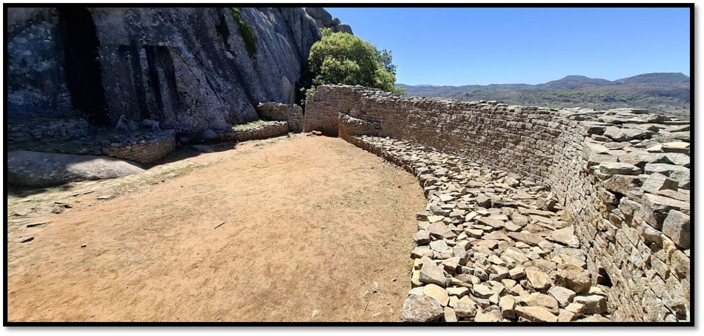 The outer wall and courtyard of the Eastern Enclosure (B) that may have been the place where the spirit mediums connected with their God Mwari and the ancestors. Clearly a sacred area as several soapstone Zimbabwe bird sculptures were discovered here reinforcing the belief this area had ritual and religious significance.