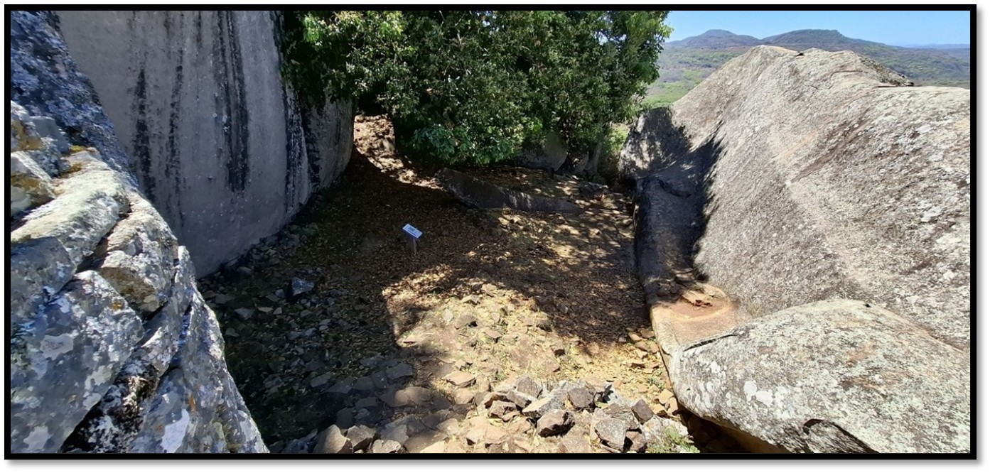 The small cave above the Recess (E) / Southern Enclosure (F) that may have been used by the spirit mediums or an oracle to communicate with the ancestors and has the remarkable acoustic property of transmitting words spoken in a normal voice that can be heard 600 metres away in the Great Enclosure provided there is no wind. S.D. Sandes, curator from 1948 – 59 was told about this phenomena by his African staff in 1950 and tested it several times. Undoubtably this acoustic effect played a spiritual part in the siting of Great Zimbabwe.[17]