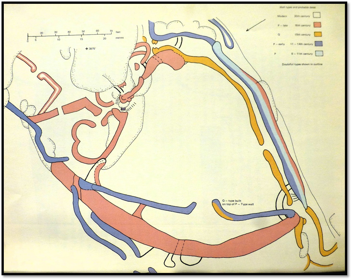 R. Summers: Plan of the Western Enclosure on the Hill Complex with age of walling. Blue = 8-11th Century, Grey = 11th-14th Century, orange = 15th Century, red = 16th Century