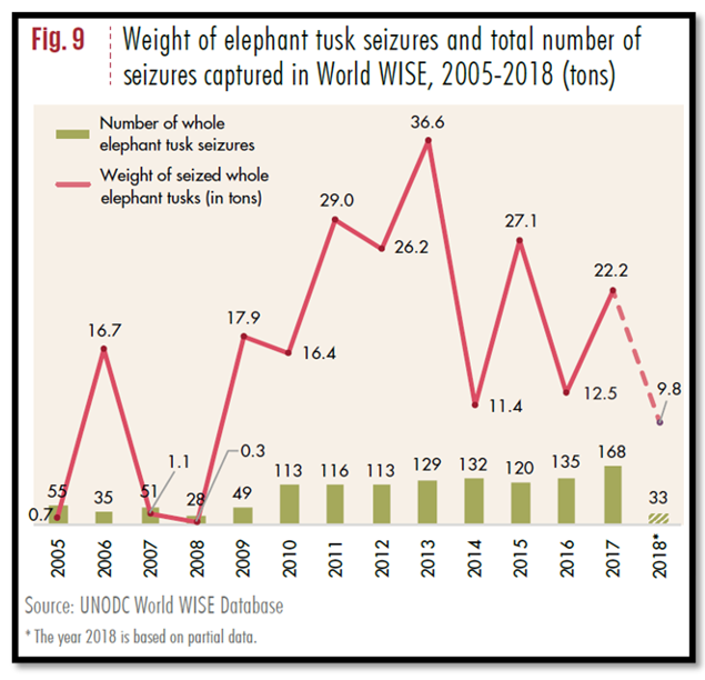 This article almost entirely relies on the United Nations Office of Drugs and Crime (UNODC) report called the World Wildlife Crime Report 2020: Trafficking in Protected Species hereafter called “the report.” I have extracted most of the information relating to elephant ivory from that report which is available as a pdf from their website. Most of the report and conclusions have been copied verbatim.