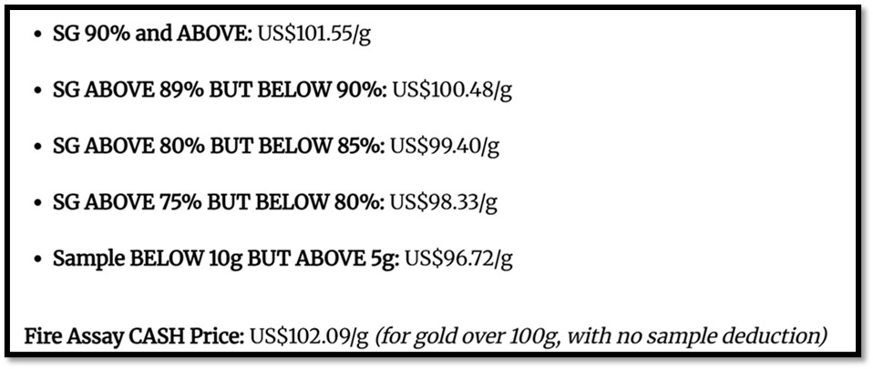 After years of ASM being exploited by Fidelity Gold Refinery (FRG) and its predecessors by being underpaid or being paid partly in Zim dollars, FRG announced prices past US$100 per gram in 2025 and for tens of thousands of small-scale miners who form the backbone of local gold production in Zimbabwe this is a just reward for their efforts and a motivation to sell their gold through the FRG rather than to gold smugglers often linked to ZANU-PF officials. The full price breakdown at 27 May 2025 from FRG was as follows:[23]