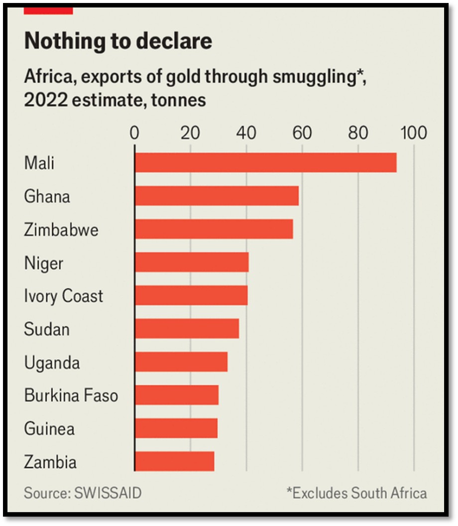 A recent report by Swissaid, an NGO, reckons that most of the smuggled gold from Africa is refined in the United Arab Emirates (UAE) where it is refined and loses its identity and its source becomes opaque due to Dubai’s “no questions asked” approach to African gold encourages illicit trade.. (https://www.swissaid.ch/en/articles/on-the-trail-of-african-gold/) Gold exports from the United Arab Emirates (UAE) went up more than 60-fold between 2002 and 2022; gold is now the most valuable export from the UAE after hydrocarbon products.