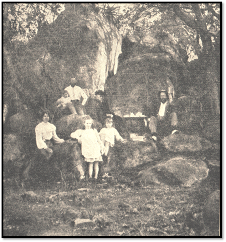 Rev W.A. Elliott: A Matobo picnic near Dombadema. Rev Cullen Reed with hat