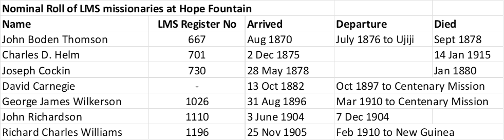 David Carnegie is a surprising omission from Sibree’s list of LMS missionaries. For more detail and photos of Hope Fountain Mission see the article Hope Fountain Mission under Matabeleland South on the website www.zimfieldguide.com