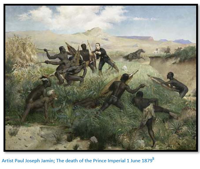 [li] Napoléon Eugène Louis Jean Joseph Bonaparte (1856 – 1879) the Prince Imperial of France was permitted by Queen Victoria to join the British Army in Zululand. He was part of a small reconnaissance patrol in the area around Mount Otelezi which was believed to be free of Zulu forces. With just a small escort they arrived at cattle enclosure around 2.30pm on 1 June 1879 and stopped to investigate. No pickets had been posted whilst the Prince made some sketches of the area when about forty Zulu’s ambushed the party.