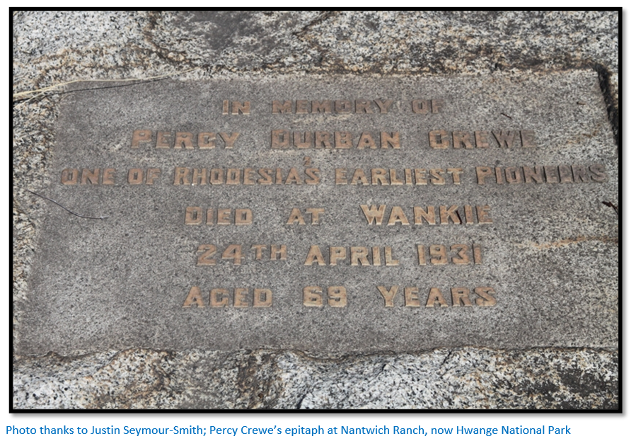 Percy Crewe was a festive man, and well known for it with an earlier reference to “keeping M’tjete alive on port and champagne.” Gary Haynes in his book Hwange National Park: The Forest with a Desert Heart states that long-time acquaintance and fellow farmer in the Wankie District, H.G. Robins, felt that alcohol was the downfall for Percy Crewe. His long-time female companion, Vuvuka, was well-known for making strong traditional African beer. He lived at Nantwich until he died on 24 April 1931 and is buried there.