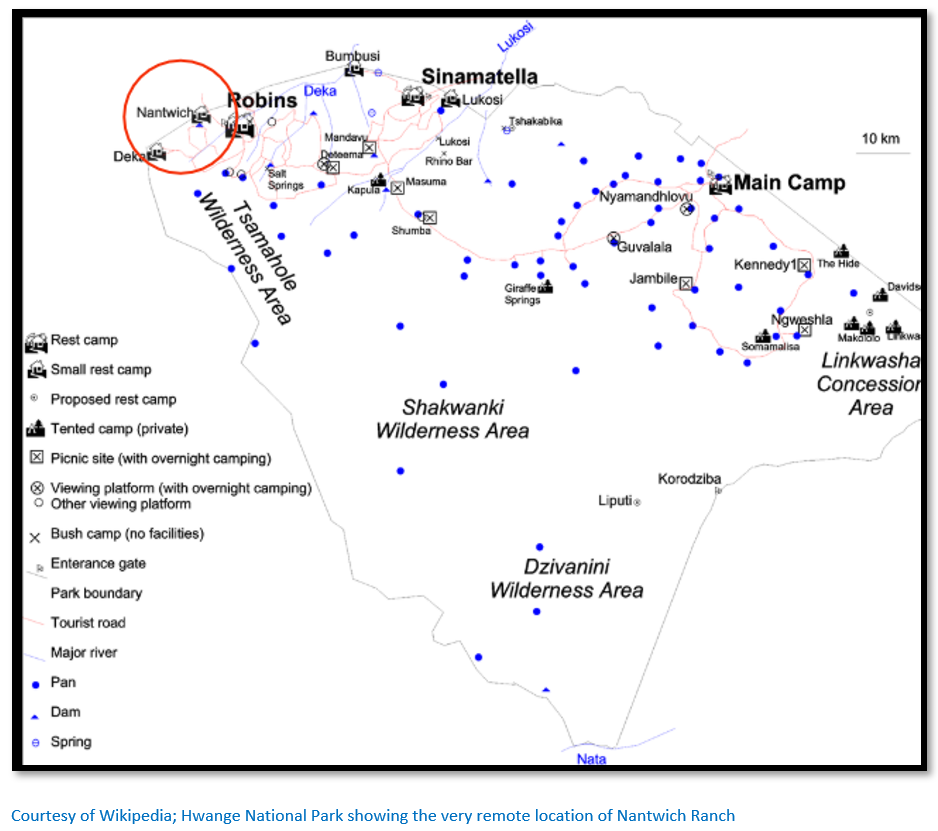 After the 1896 Matabele Rebellion or Umvukela in which he served as a sergeant, Percy Crewe, whose reminiscences are recounted above, became well-known locally in Matabeleland through prospecting and mining and as a broker of both land and native labour. He then worked for Albert Giese on a Deka farm, supplying beef to the Wankie [now Hwange] coal mine. Then he became a storekeeper, and finally a rancher, having bought 22,000 acres of land west of Hwange which he called Nantwich Ranch, which Gary Haynes calls a kind of geographic joke as Crewe and Nantwich are located near each other.[53] Nantwich was almost on the border with Botswana, but now forms part of Hwange National Park.