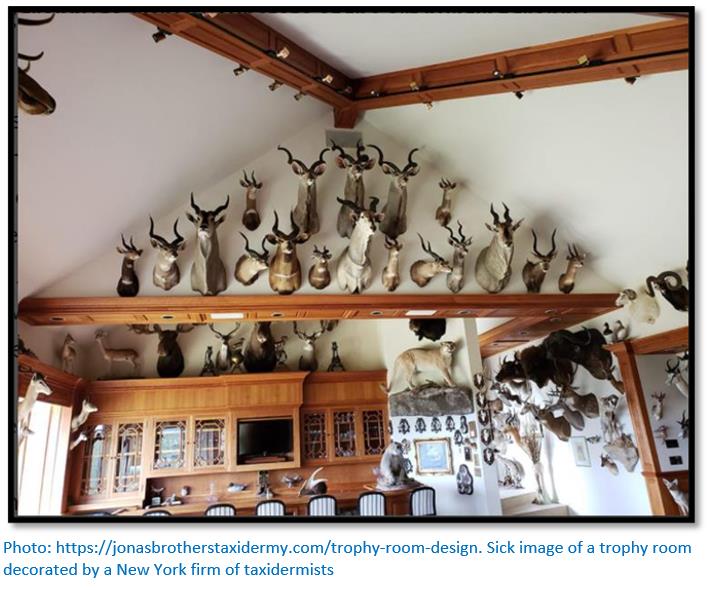 She writes: “When most people think of a hunting trophy, they imagine elephant heads and tusks, maned lion mounts and leopard skins. But U.S. trophy imports include everything from fish and birds to reptiles and lots of mammals. It can get bizarre: baboons stuffed with a hand held out to hold your keys, or 7-foot-tall giraffe neck-and-head mounts