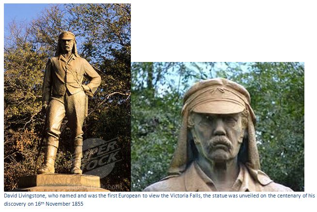 The David Livingstone statue is sited on the far left of the Falls near the Devil’s Cataract viewpoint and commemorates the fact that on 16 November 1855 he was the first European to gaze upon this sight.
