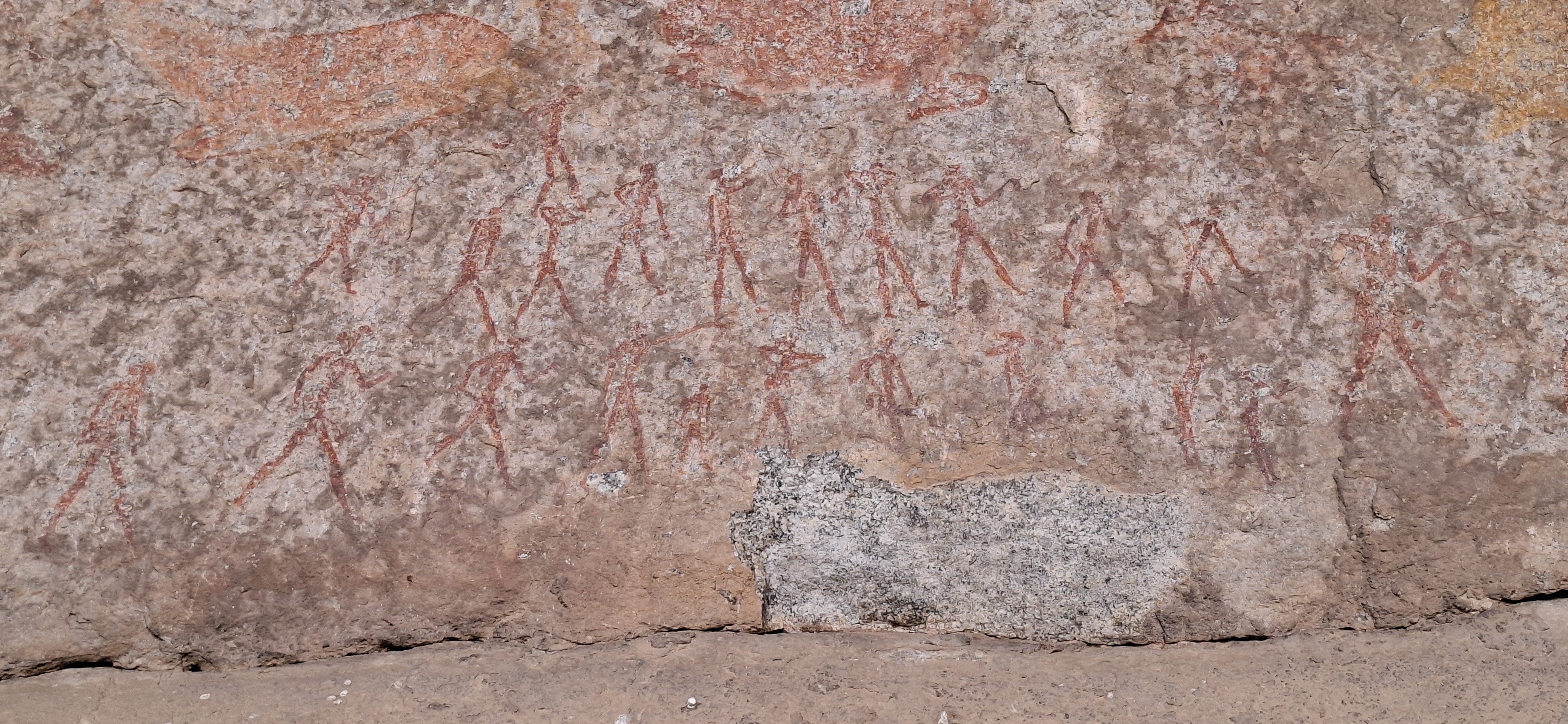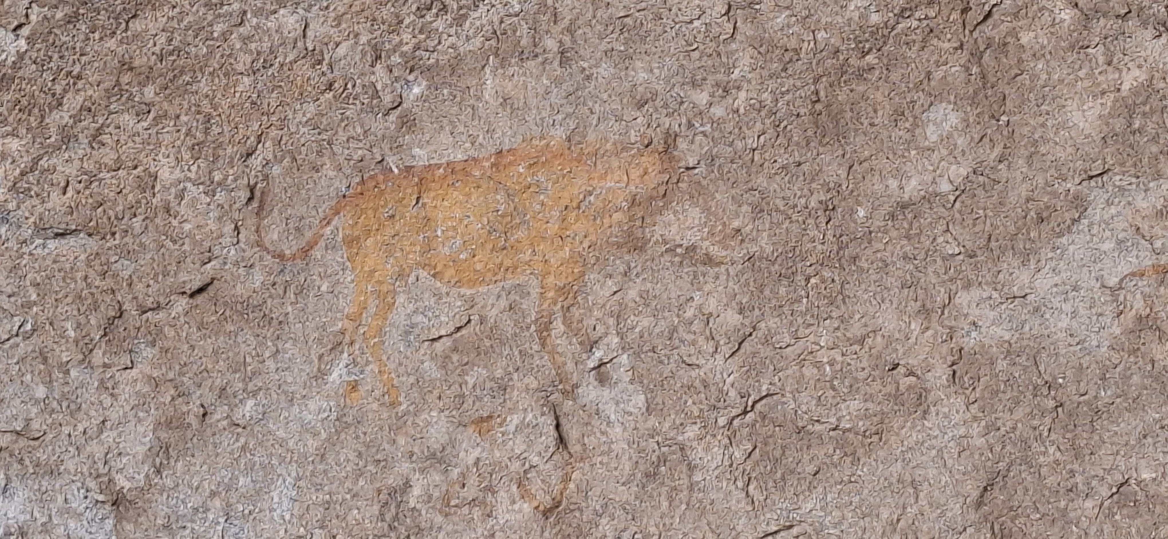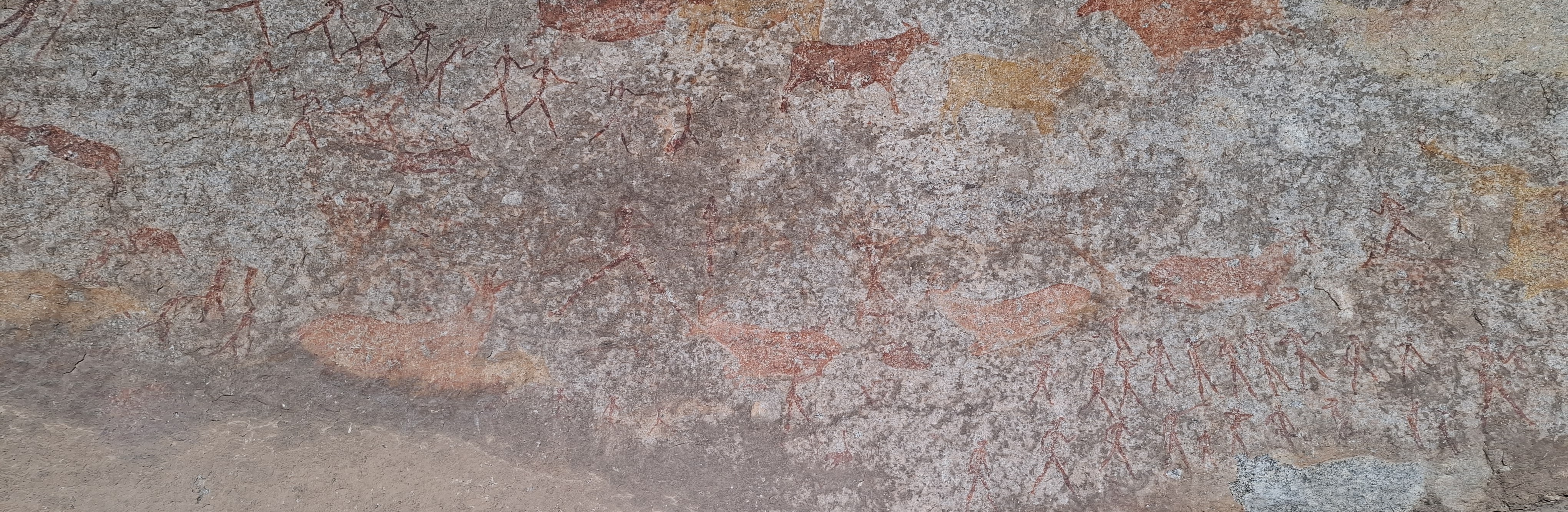 On the far left of the cave is a small giraffe with seated human family groups alongside. A faded ochre feline is beneath two running hunters with the faint bremains of a large rhino. To the right is another faded yellow ochre feline with the outline of a zebra underneath and the head and neck of a large giraffe with a elongated, recumbent figure, hand to head, above its back. Then three faint humans, to their right are three small dark tsessebe and a figure possibly in trance.