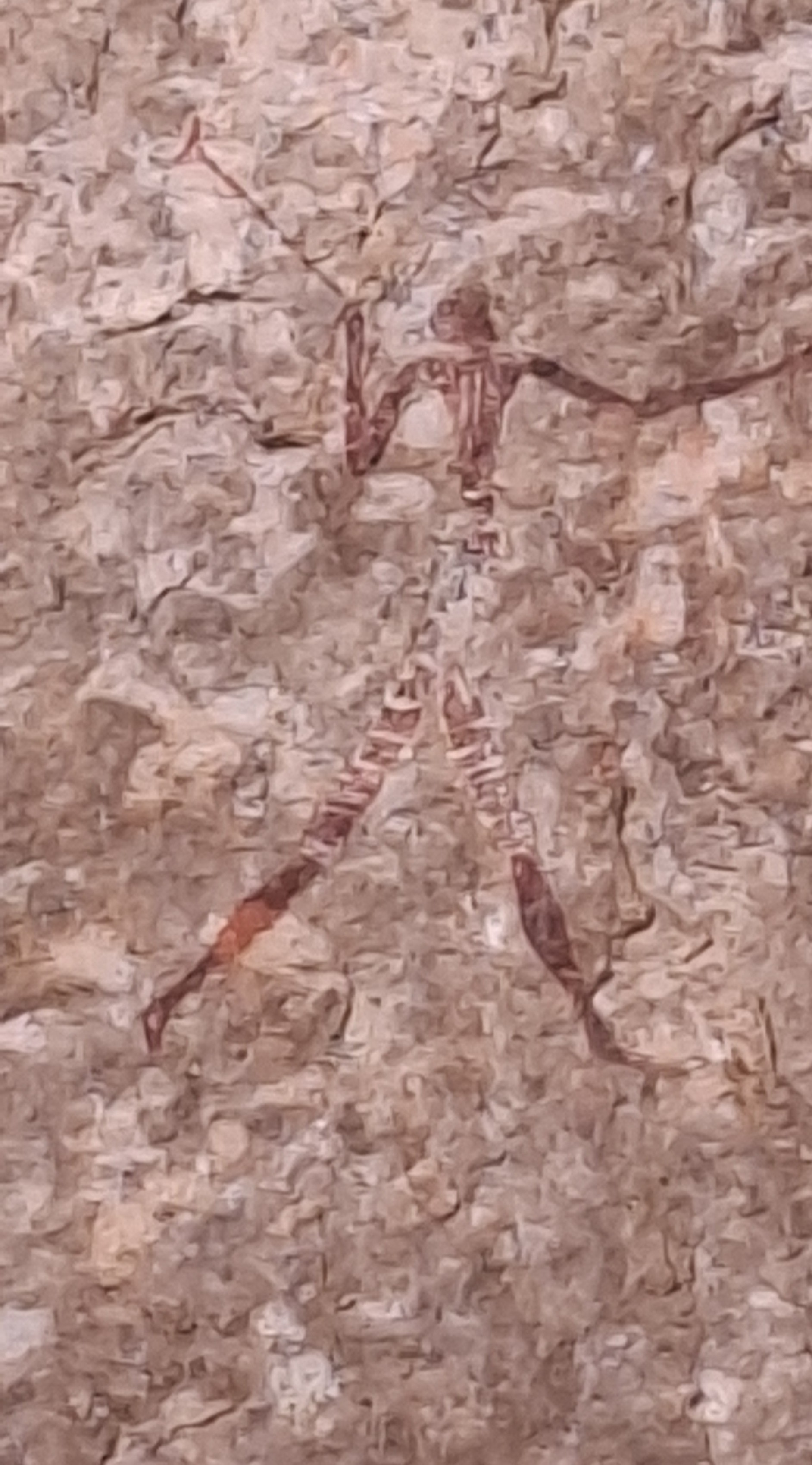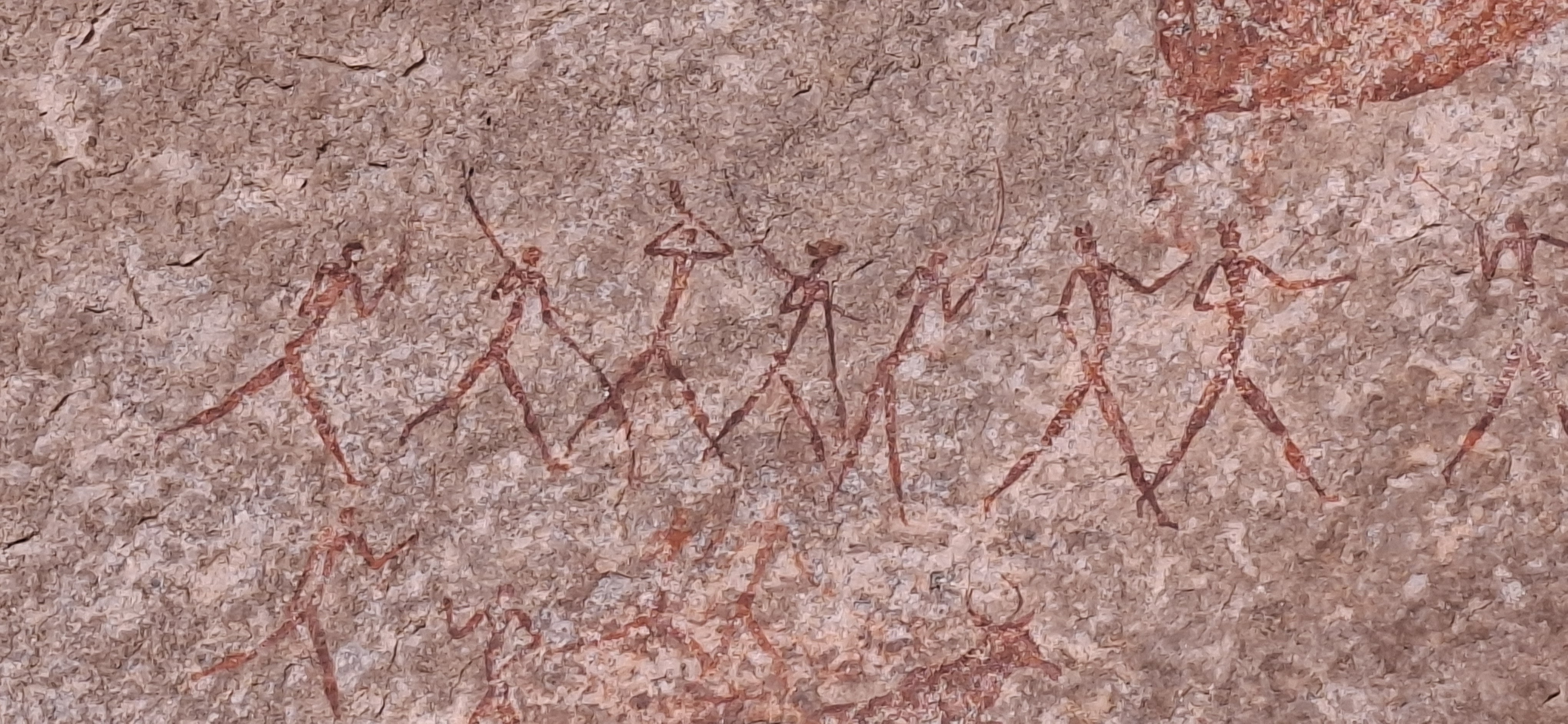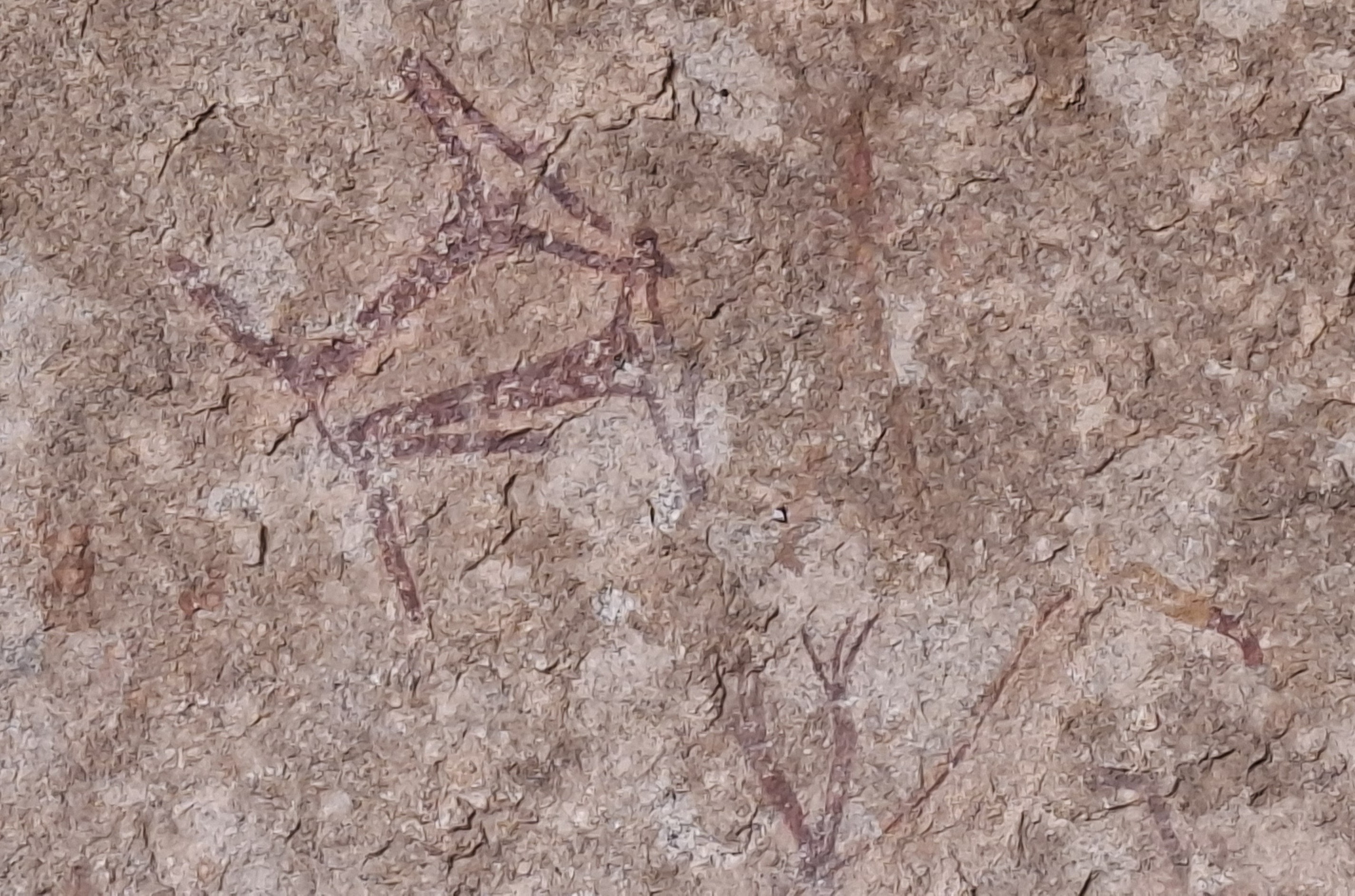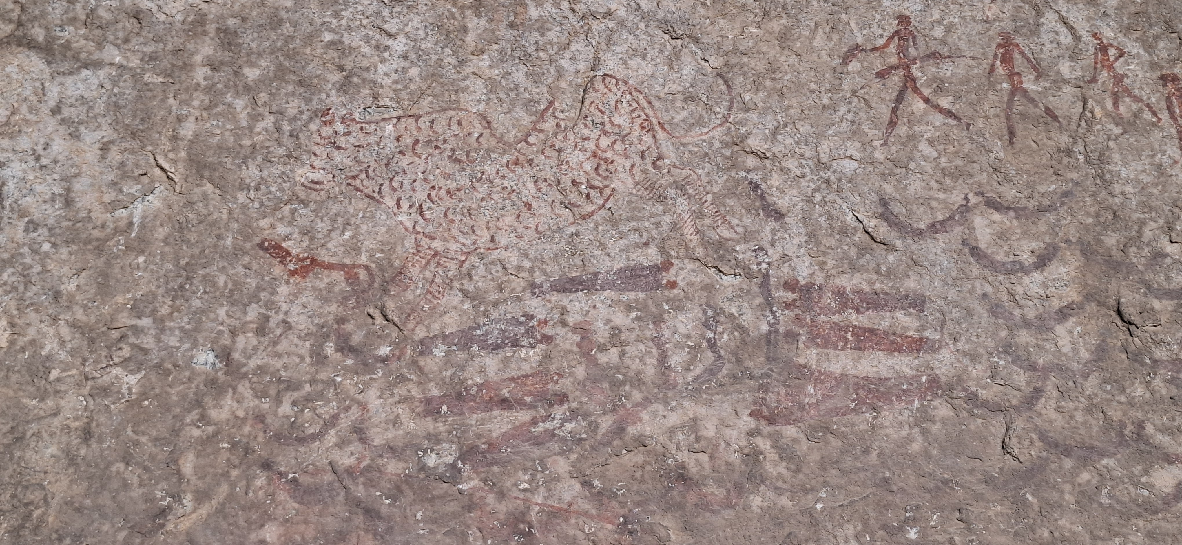On the far left of the cave is a small giraffe with seated human family groups alongside. A faded ochre feline is beneath two running hunters with the faint bremains of a large rhino. To the right is another faded yellow ochre feline with the outline of a zebra underneath and the head and neck of a large giraffe with a elongated, recumbent figure, hand to head, above its back. Then three faint humans, to their right are three small dark tsessebe and a figure possibly in trance.