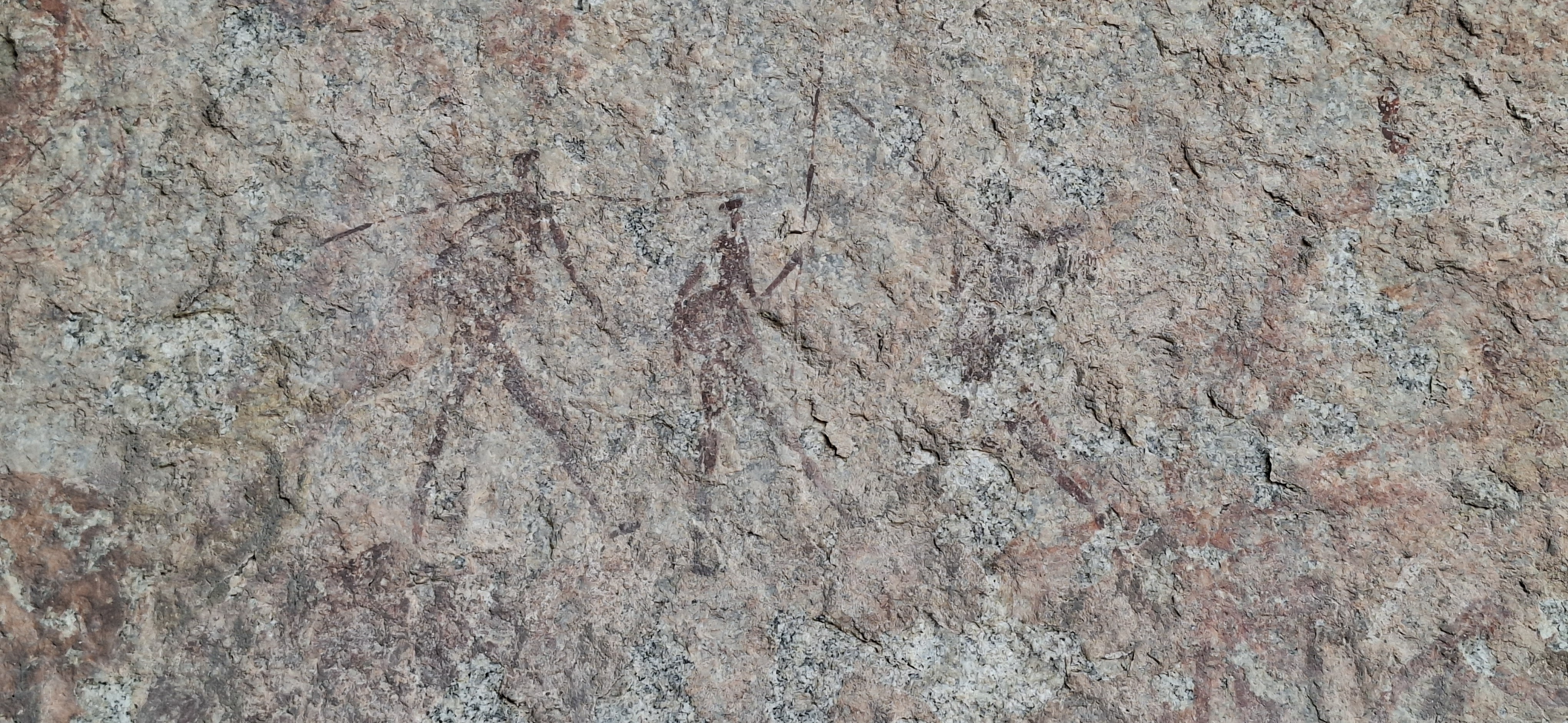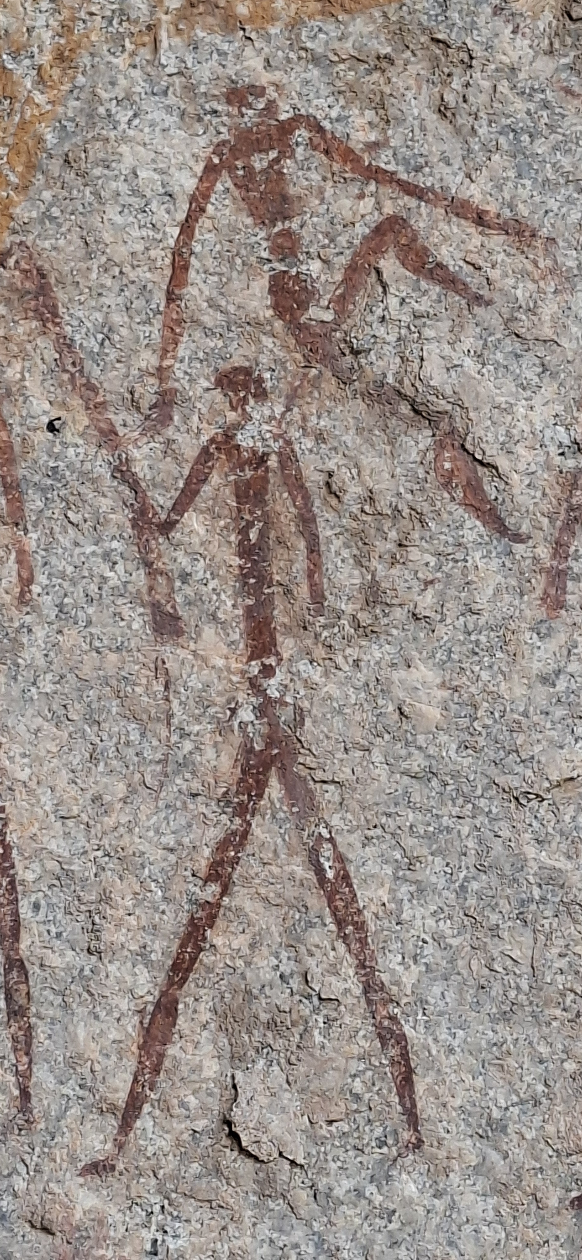 On the right side of the frieze are a pattern of parallel lines with one human figure within them and four other humans attached. The lower lines become a small human obese torso with arms raised. A line from its hand leads to a similar figure beside it holding a crescent. a second line leads to a pair of squatting figures. A third figure has raised arms. The design is broken by a pattern based on a pair of striped lozenges joined together that Garlake states is a recurrent Matobo feature.