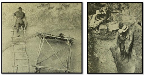 Armstrong tracing rock art: Prof L'Abbey Breuil Prof L’AbbĂ© Breuil and Armstrong on the 6 foot level, Rev Neville Jones and Mrs Jones above