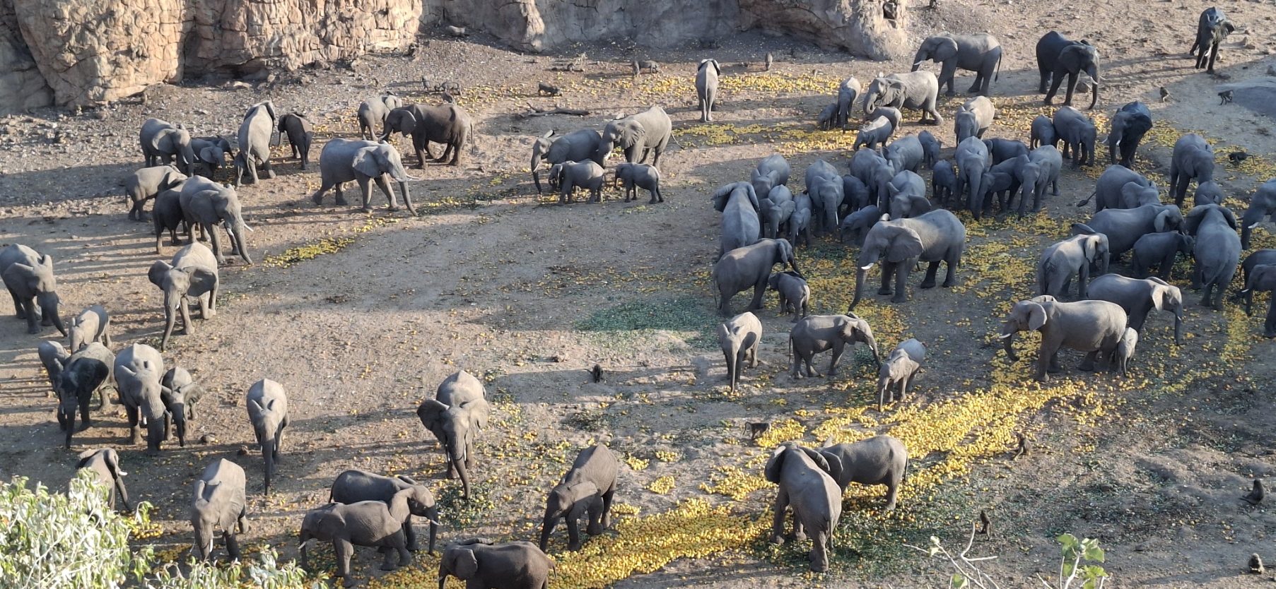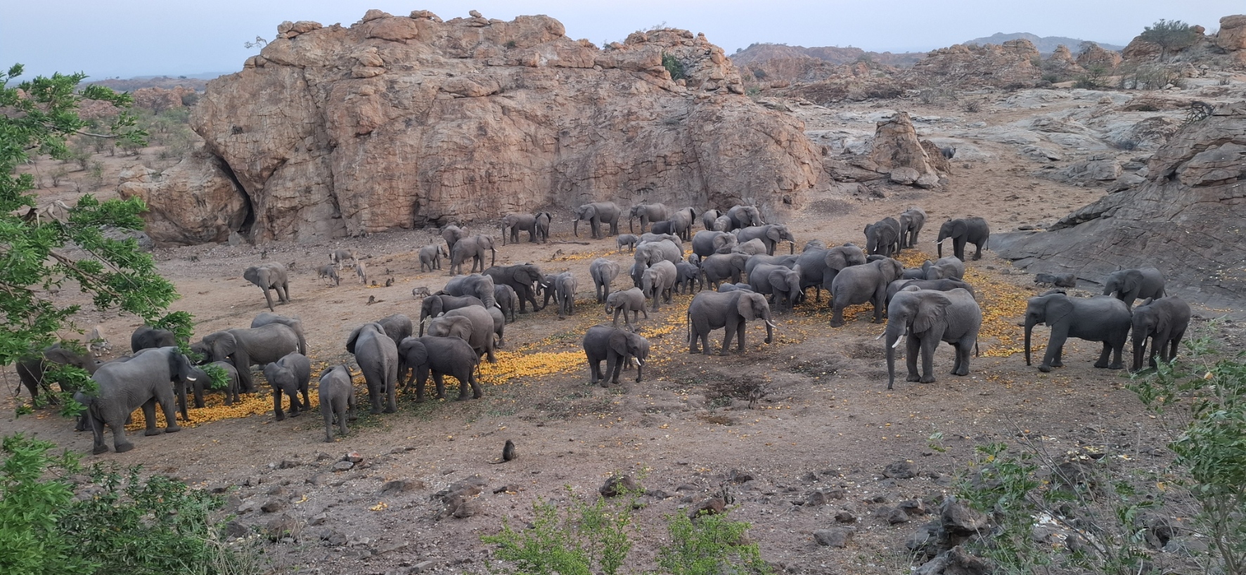 Overview of the elephants gathering in the early afternoon at the Fly Camp
