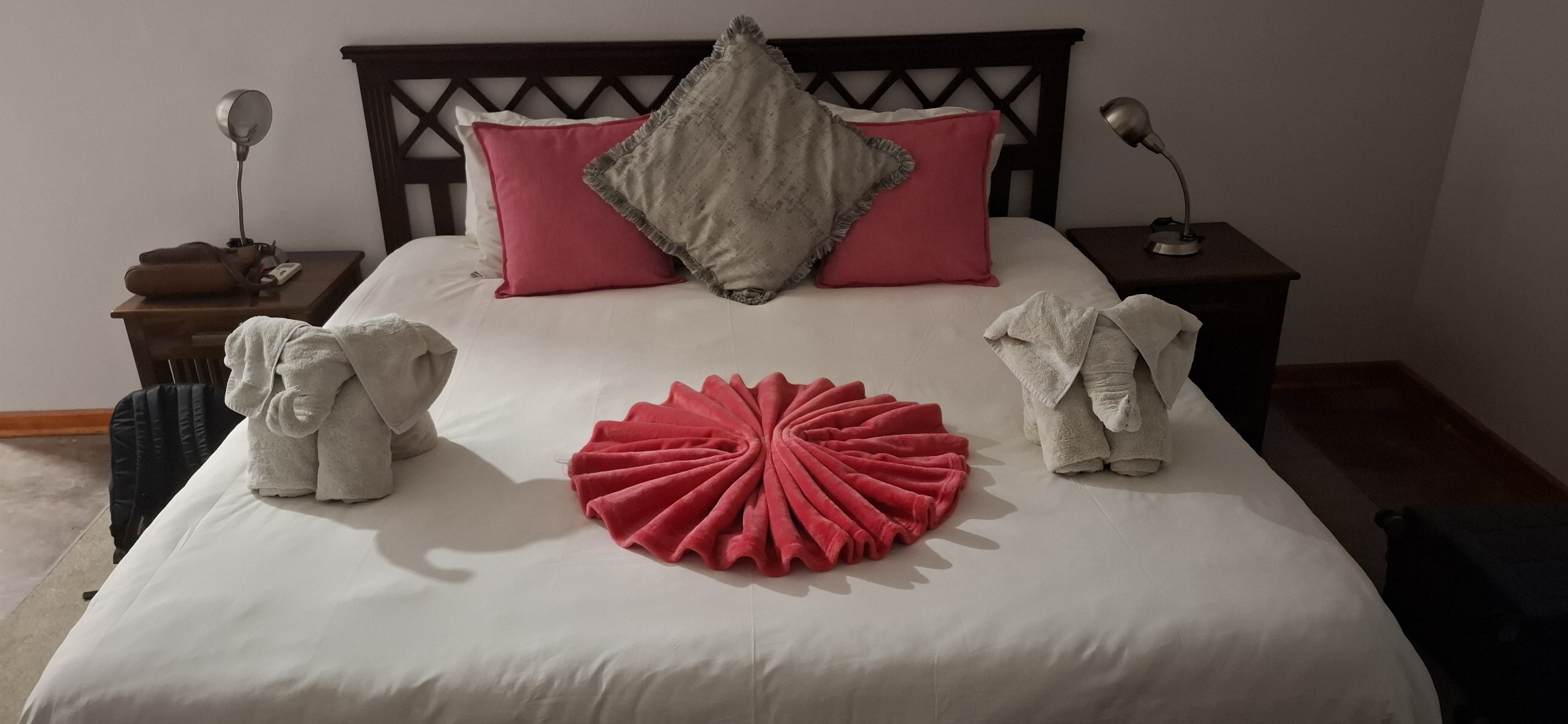 The seven chalets all have views over the dam and are surrounded by lush green lawns, gardens filled with succulents and sprinkled with bright bougainvillea and indigenous trees. Each chalet has three beds and they are equipped with air conditioning, bar fridge, tea and coffee facilities, en-suite bathroom with toilet and shower, bath and basin. The chalets are serviced daily by helpful staff that will also do your laundry which is included in the daily rate. Twenty-one guests is the maximum that can be accommodated at any one time.