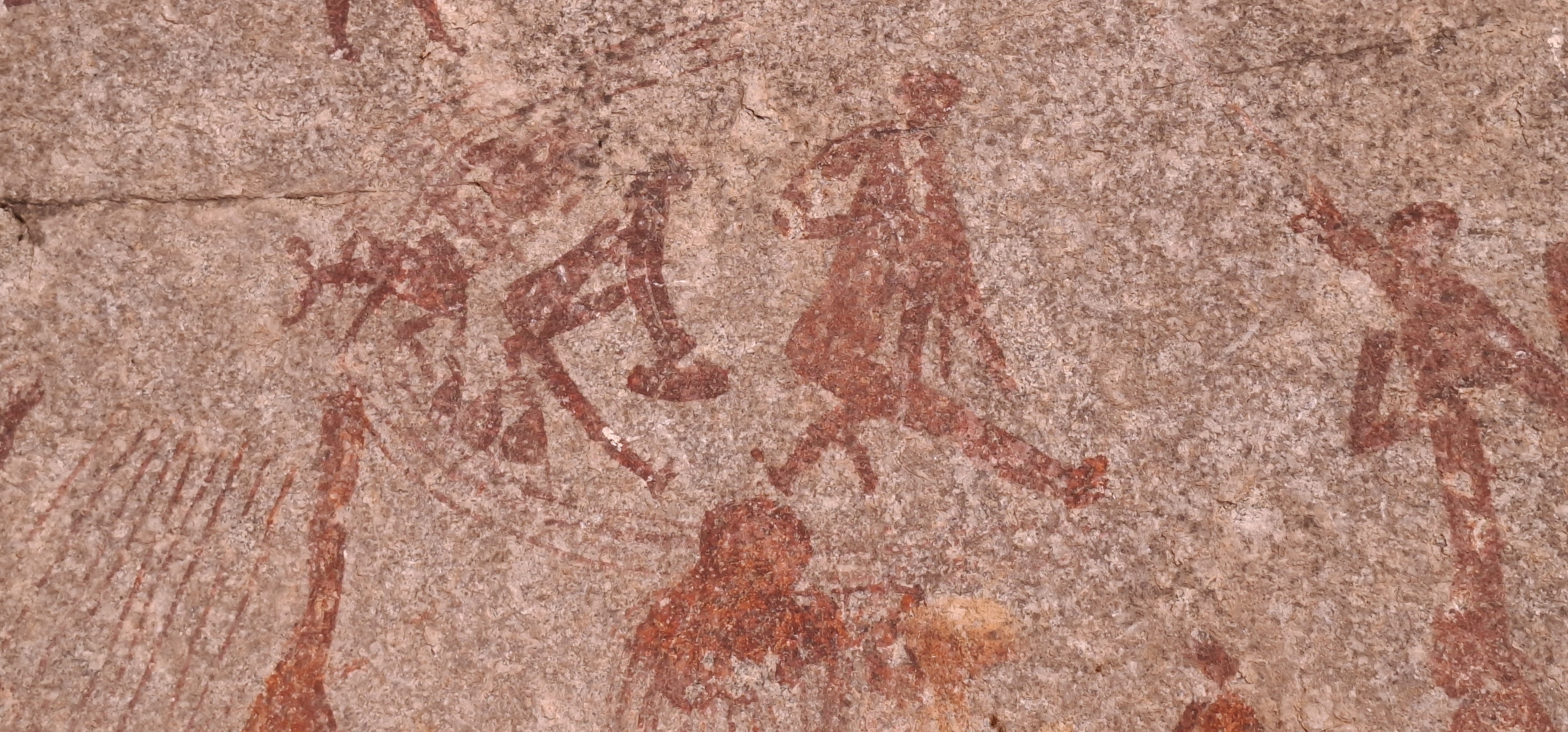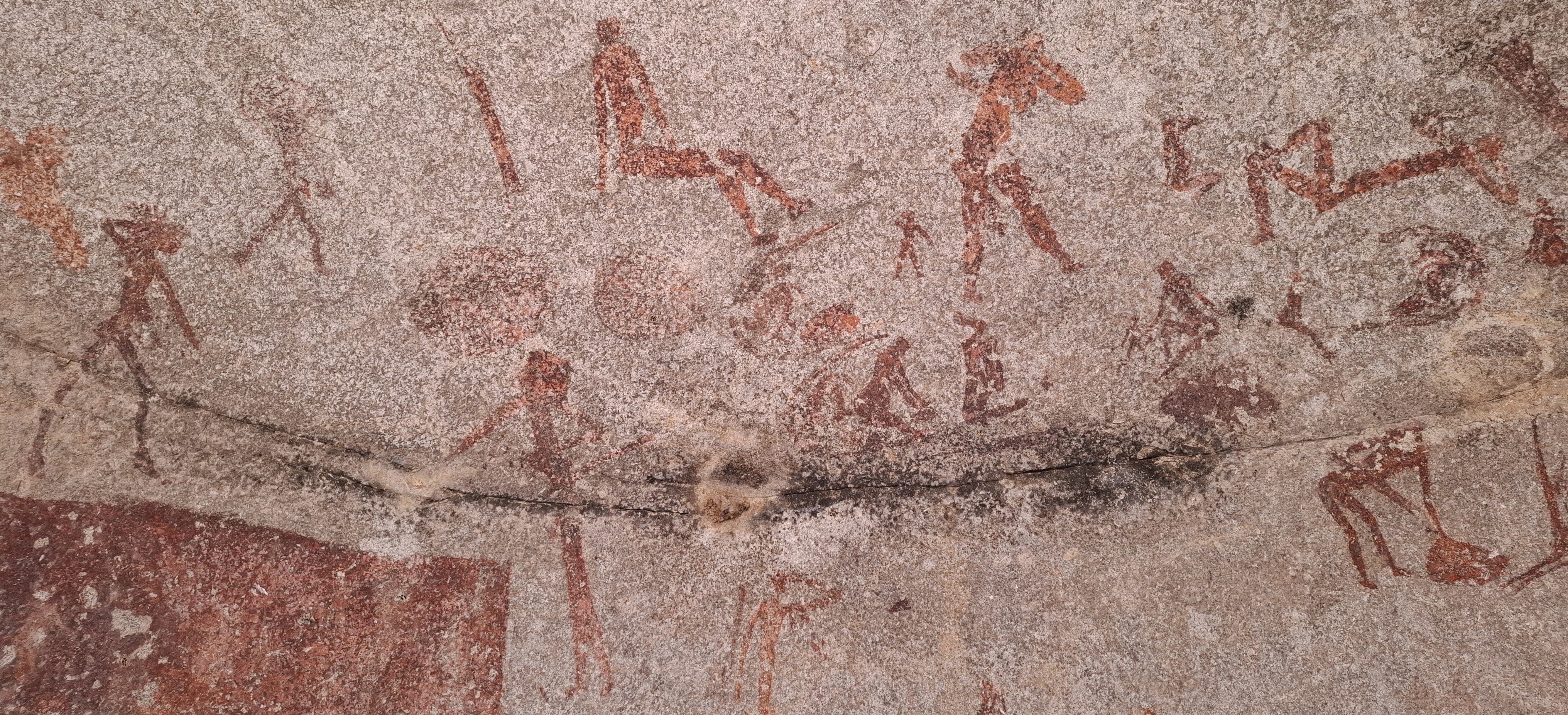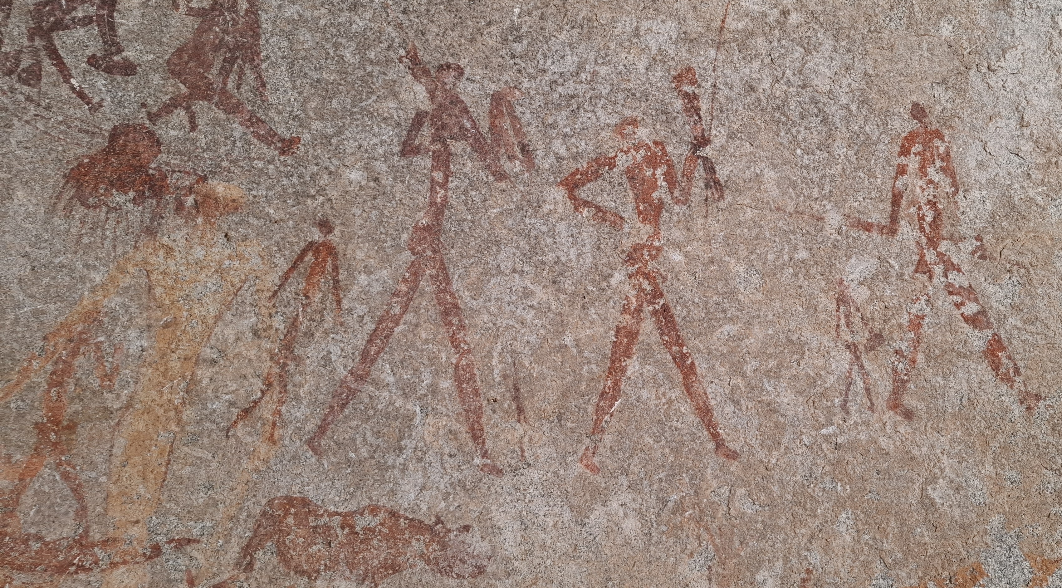 High on the left of the cave are are four large walking figures of two tall hunters and two smaller figures that have large bundles that appear to have been superimposed at a later date.
