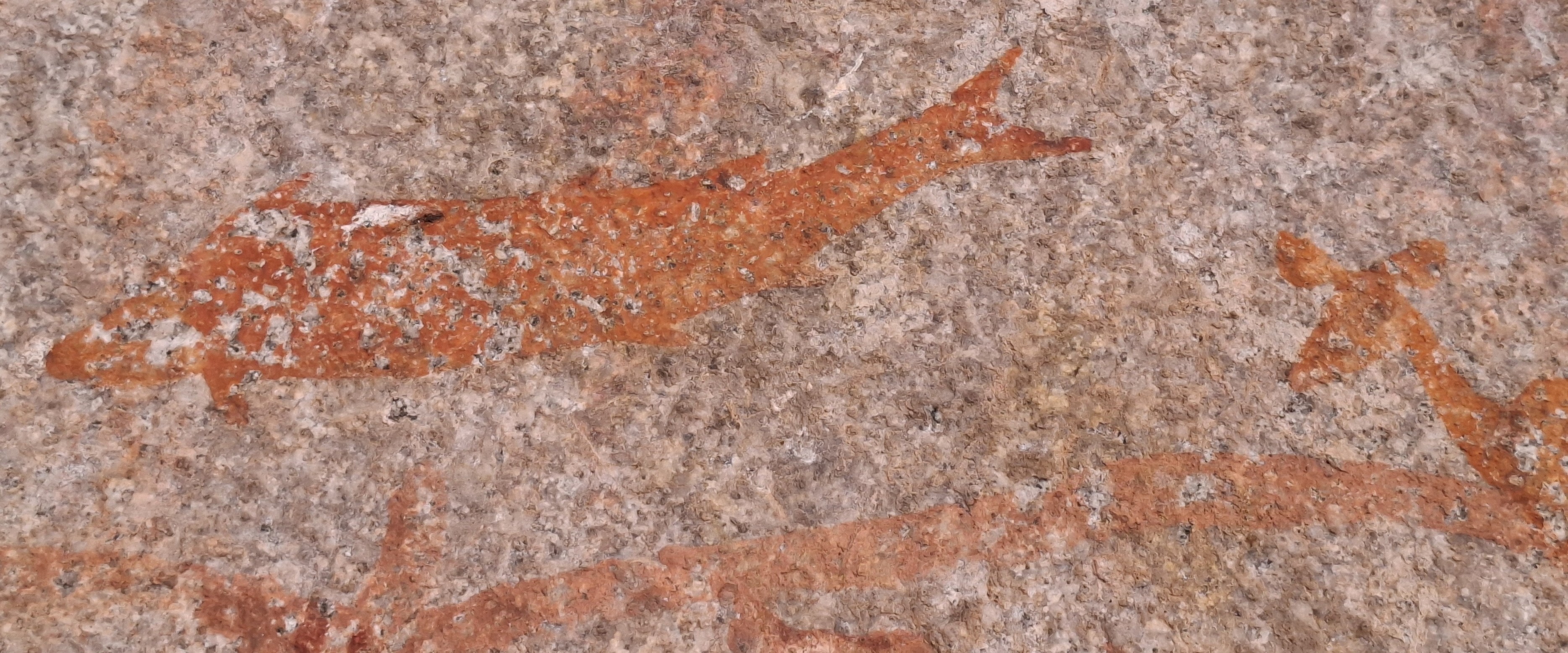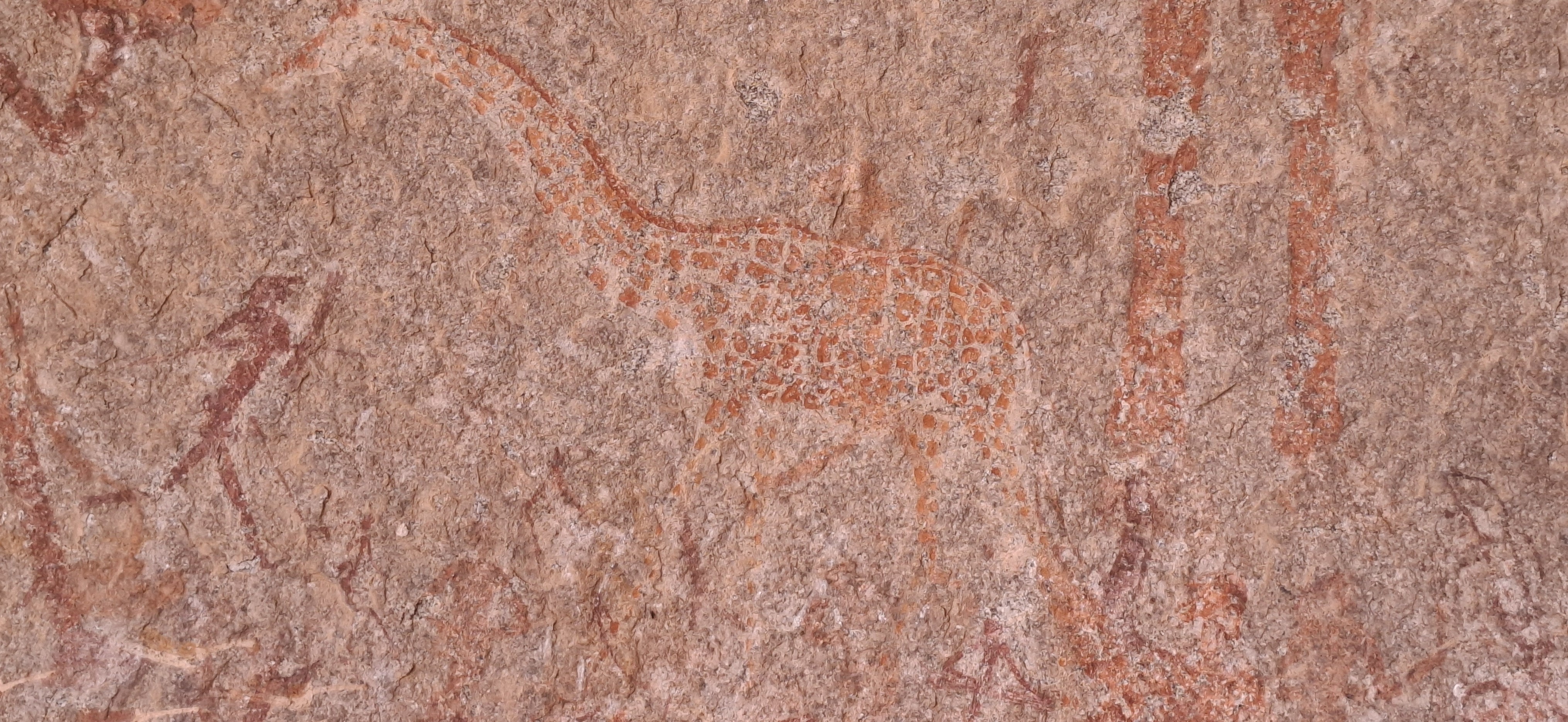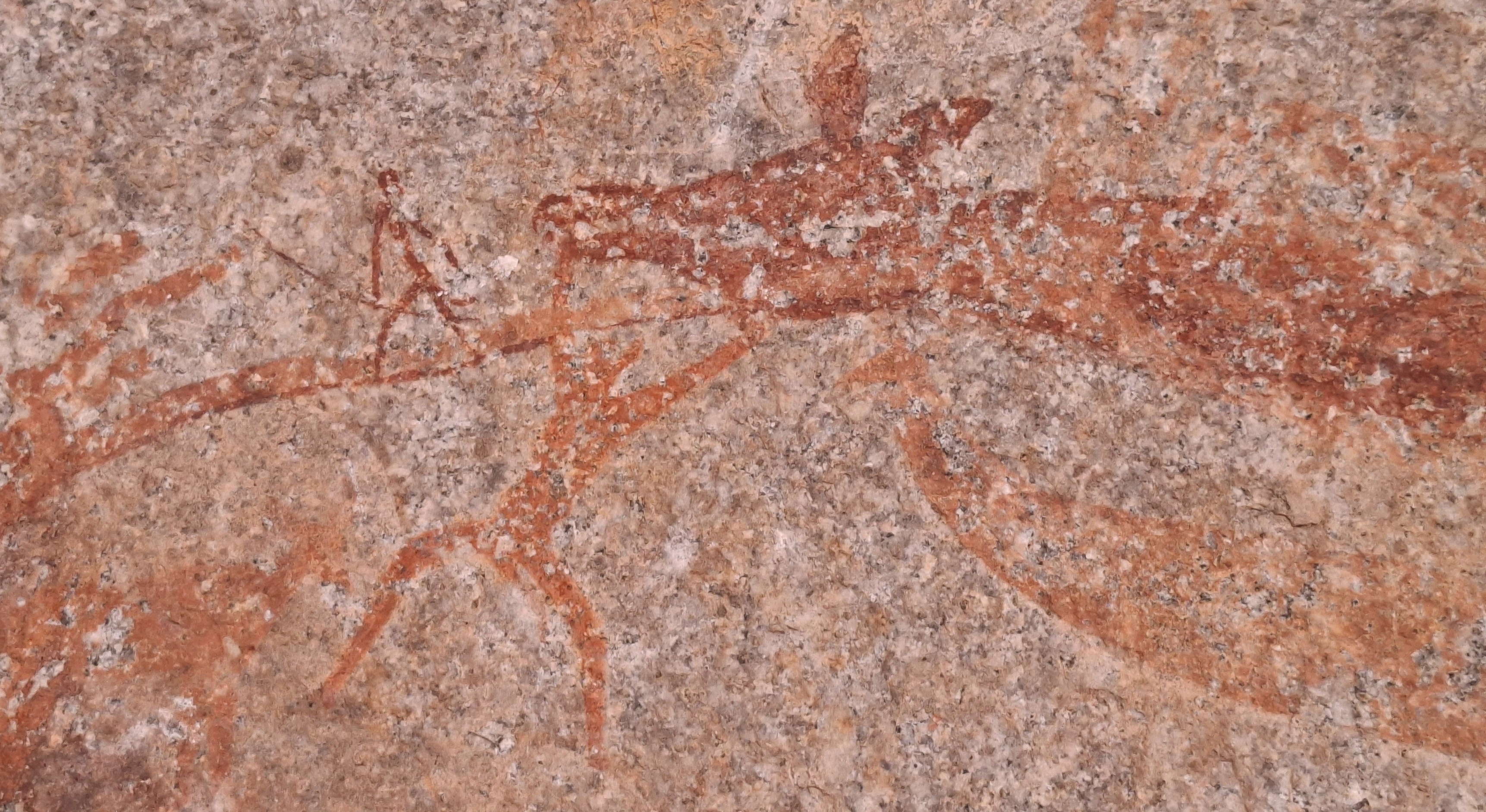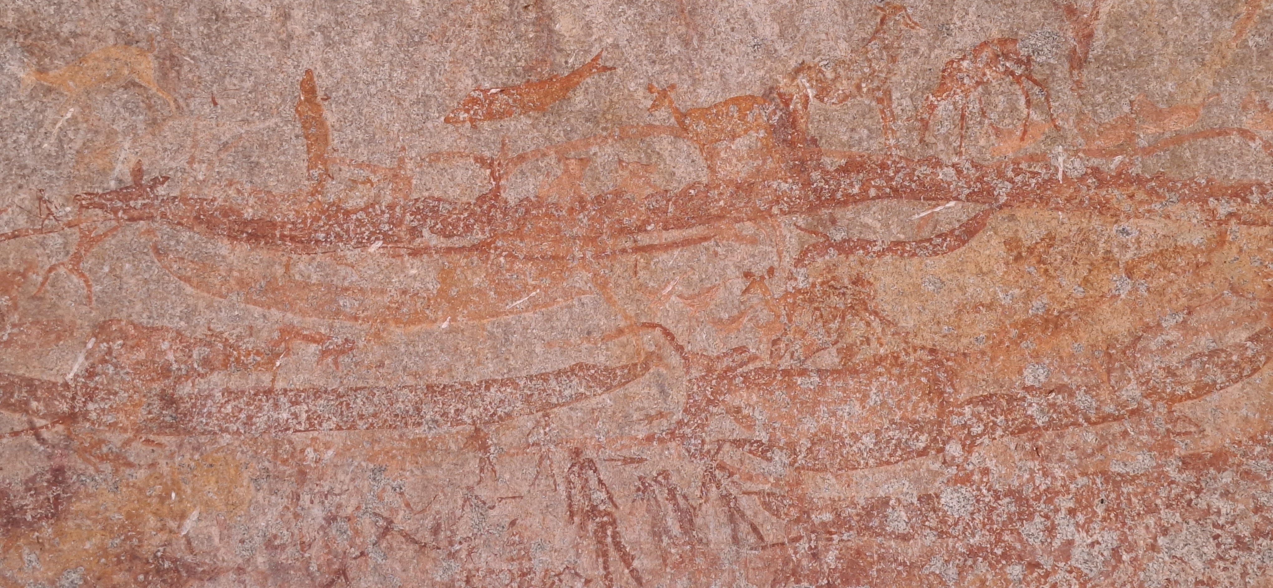 The lower paintings have five large snakes with animal heads and thin tails at their centre. A small figure with large ears hangs from the top snake's head. Above are some shaded fish and a beautifully drawn small antelope with the only flying termite next to its hind legs. Other small antelope, some lying down, others grazing, are above the snake's back. Superimposed on the snake's back ate two small pale figures with ears resembling those of kudu and their arms raised and at the snake's tail, a small hippo. another beautifully depicted antelope. and a woman with bag and digging stick. Under the snake are a wildebeeste, some polychrome antelope, a lizard and a flock of birds.