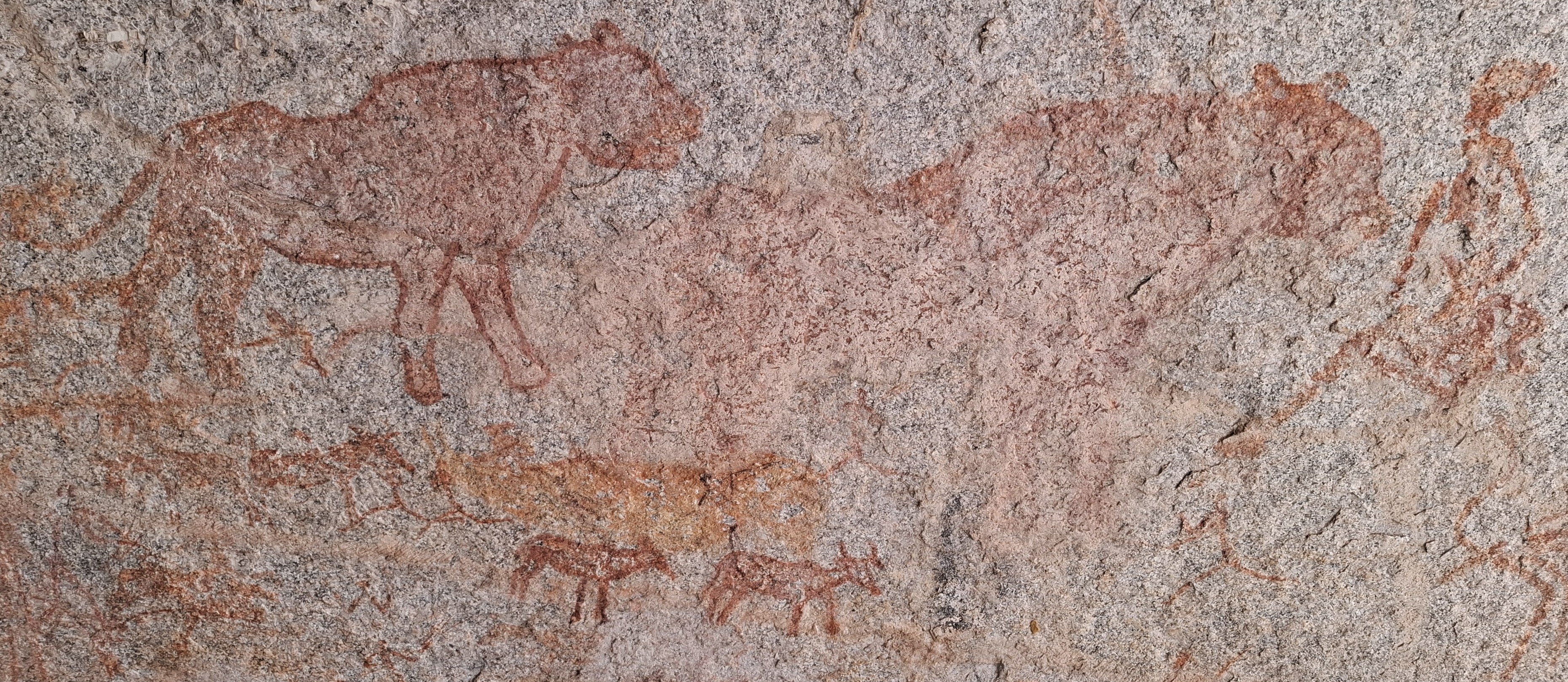 On the extreme right of the cave are two large felines, antelope including tsessebe and two sitting humans, joined by a line, one with a cylindrical object in its mouth.