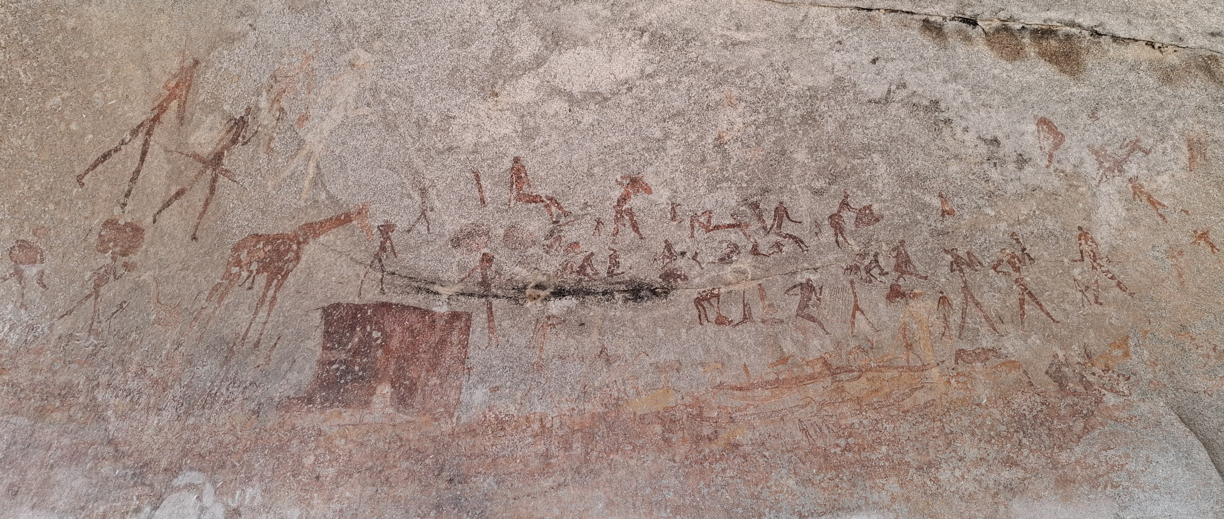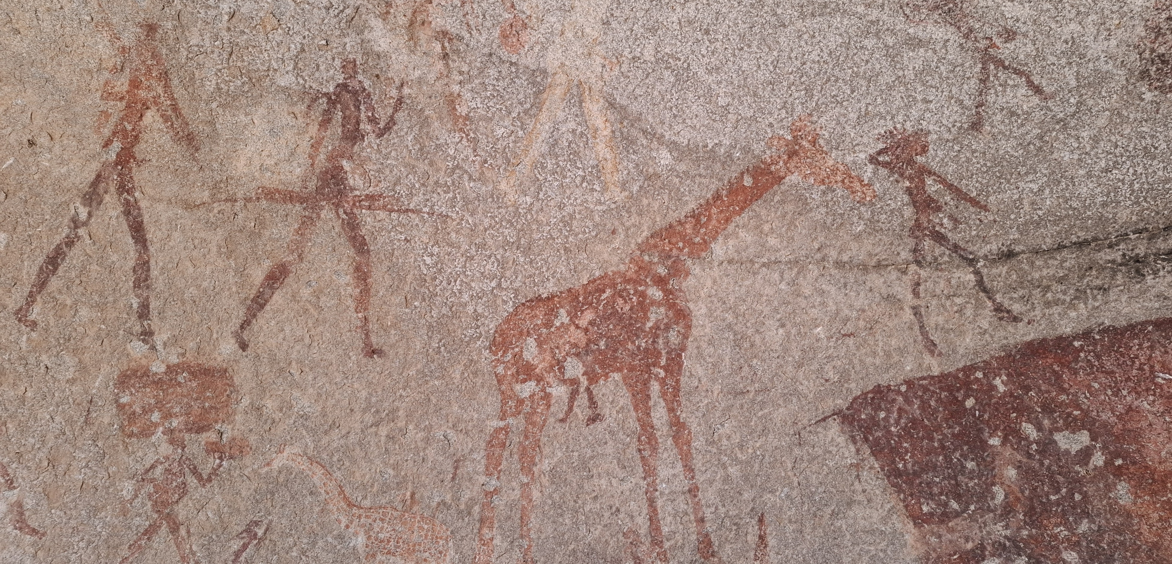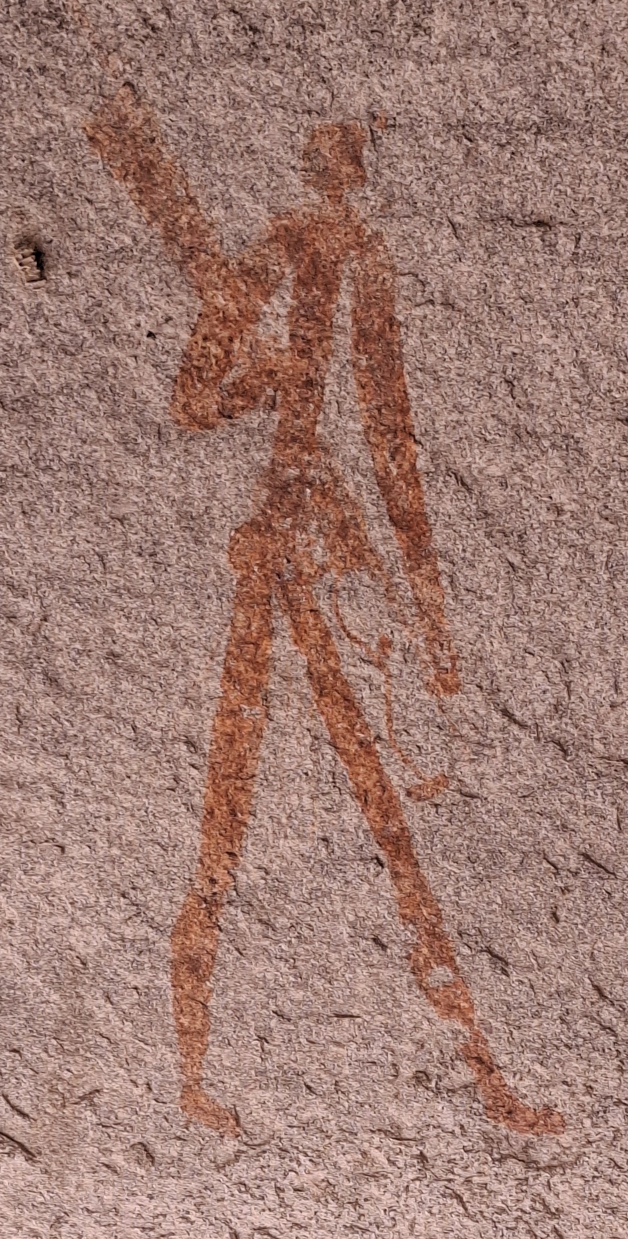 On the cave roof above the entrance is a single large hunter in profile with what Garlake describes as a tulip penis.