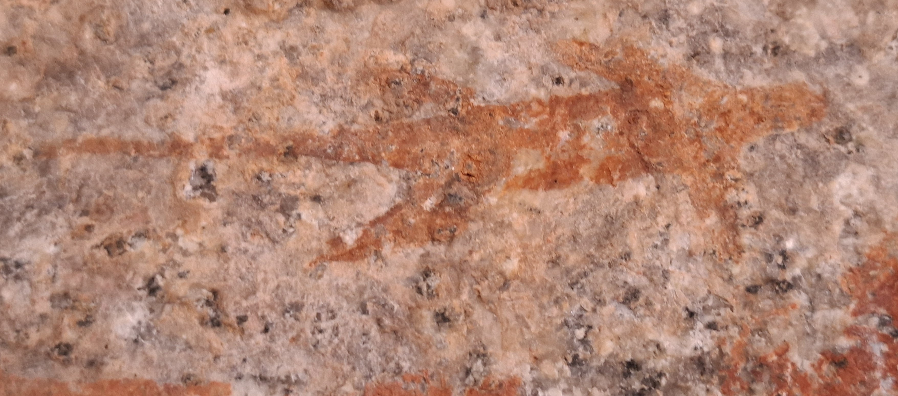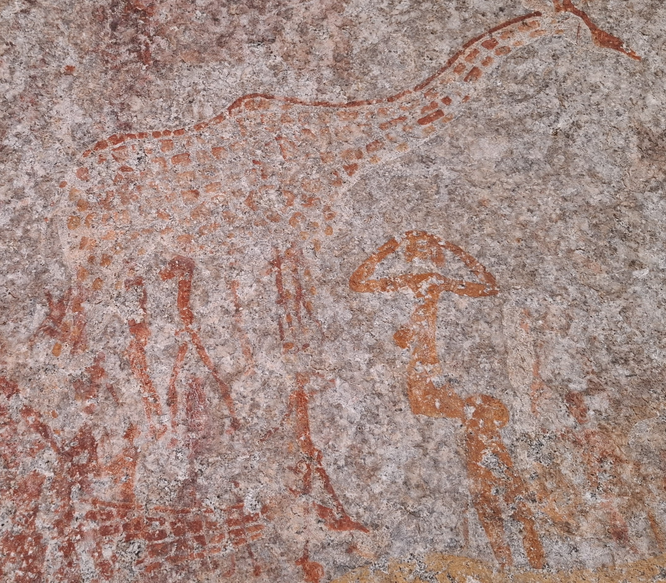 On the left another tall standing hunter with the faint traces of three very large hunched figures beside him. Left of these figures is the remains of the only large ovoid shape at Silozwane cave with white caps. Close-by are the faint remains of an elephant, some large orange kudu and giraffe. Lower down amongst an amorphous mass of paintings can be seen a lone of ochre figures, several of which aim large arrows with cresent shaped heads. One points his fingers next to a shelter with a woman with two sticks standing at the entrance. Above are the outlines of polychrome birds; probably storks or cranes.
