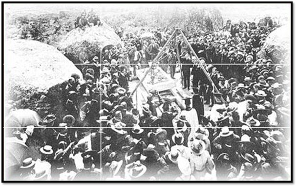 From Westacre Estate the gun carriage and coffin were drawn by oxen who pulled it to the summit of Malindidzimu without the assistance of the British South Africa Police on drag-ropes. A special funeral road of more than 25 kilometres having been carved through the rocky terrain during the preceding days by a team of about a thousand amaNdebele. Some of these historic photos are from Cecil John Rhodes: A Chronicle of the funeral ceremonies from Muizenberg to the Matoppos March – April 1902