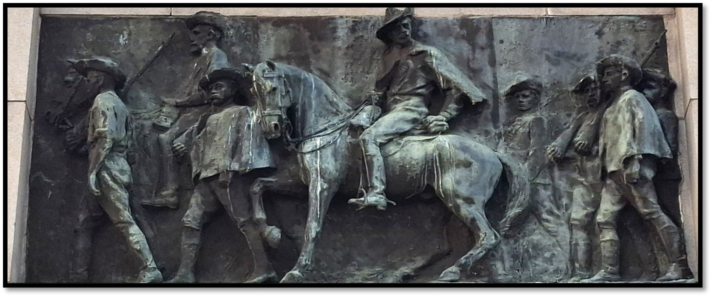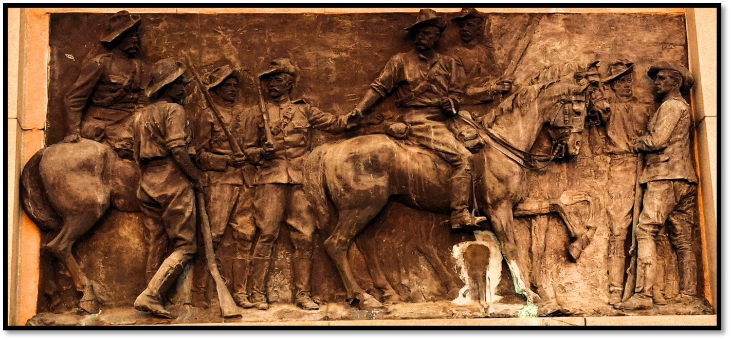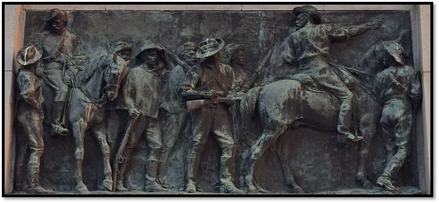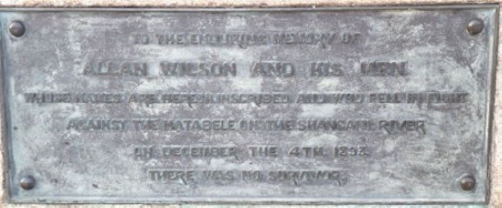 In March 1904, the remains of the small party of Victoria Rangers and Salisbury Horse led by Allan Wilson were buried some one hundred and fifty yards away in an imposing granite monument designed by Sir Herbert Baker[1] with four bronze panels by the sculptor John Tweed. The main inscription reads: “To the enduring memory of Allan Wilson and his men whose names are hereby inscribed and who fell in fight against the Matabele on the Shangani River, December 4th, 1893. There was no survivor.”