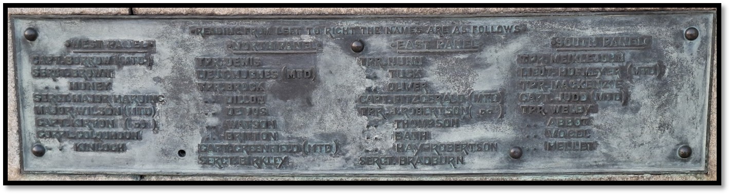 East Panel: Tpr Nunn, Tpr Tuck, Tpr Oliver, Capt Fitzgerald (mtd) Tpr Robertson (mtd) Tpr Thompson, Tpr Bath, Tpr Hay-Robertson, Sgt Bradburn