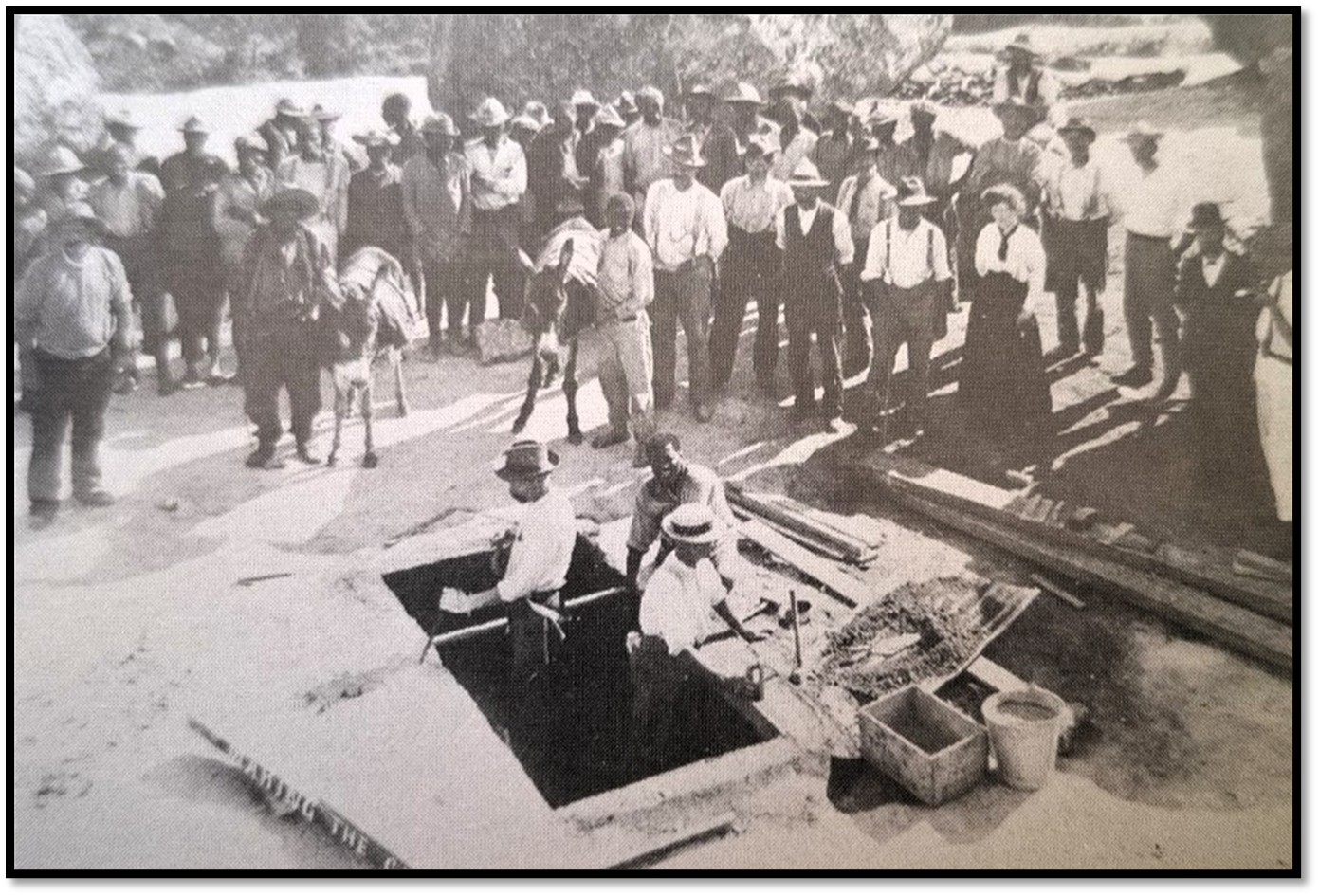 There were no motor cars in Bulawayo then, but every imaginable conveyance of those times was brought into use for the occasion – Zeederberg’s coaches which used to convey mails and passengers throughout Rhodesia (now Zimbabwe) and to and from the south, joined by buckboards, Cape carts, all drawn by spans of mules, utility carts, ox-wagons and bicycles and a big contingent on horseback. Until three weeks previously the road was merely a rough cattle track and despite the work put into it was difficult to negotiate at times, particularly on entering the hills where gangs of work men were placed at various points to make very necessary repairs after the passage of heavy vehicles.