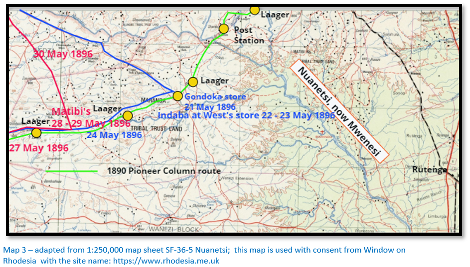 [xii] Selous’ map from Sunshine and Storm has Gondoka store just west of the junction between the Pioneer Column road and the road from the Transvaal Republic and between the Bubye and Nuanetsi, now Mwenezi rivers. I cannot see Gondoka store marked on any other map other than Selous’. The indication that West’s storekeeper was here indicates that the store was in fairly close proximity.