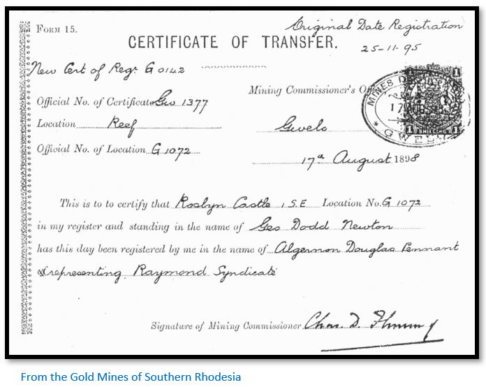 Above the Roslyn Castle[viii] gold claims transferred from George Dodd Newton to Algernon Douglas Pennant representing the Raymond Syndicate on 17 August 1898. The original registration is noted as 25 November 1895.