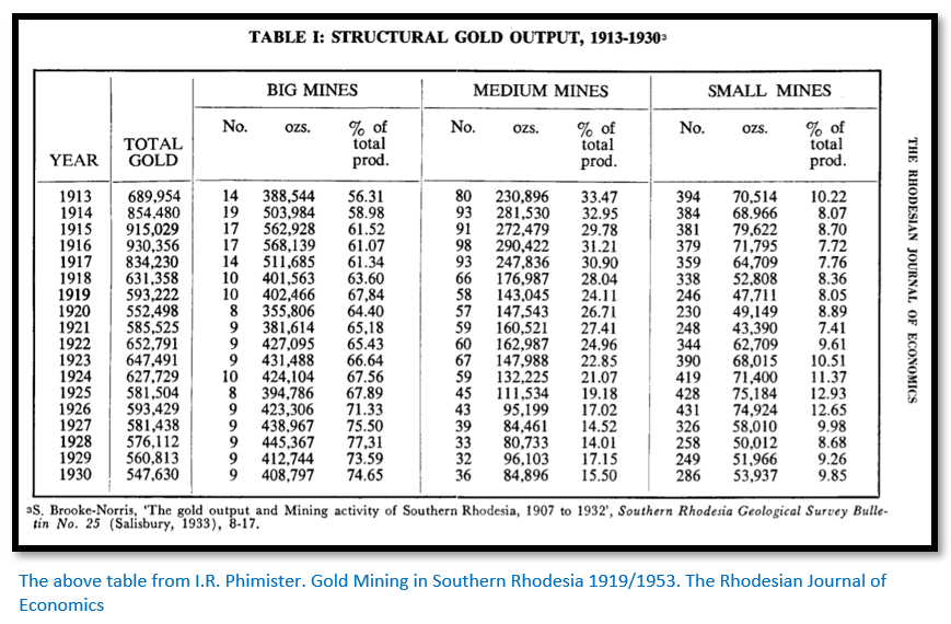I.R. Phimister. Gold Mining in Southern Rhodesia 1919/1953. The Rhodesian Journal of Economics. Volume 10, No 1. March 1976