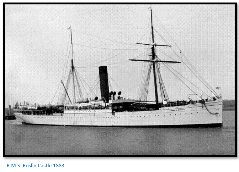 [viii] There have been a number of ships named the Roslin Castle. The S.S. Roslin Castle which belonged to the Union Castle Mail Steamship Company Limited was a passenger liner with two masts built at the Clyde in 1883 and sailed between London – Cape Town – Lourenco Marques (Maputo) She served in the Boer War as a troopship (HMT 26) and suffered heavy weather damage in 1907 and was subsequently scraped at Genoa [details from http://www.clydeships.co.uk/view.php?ref=1455] Often spoken of as the “rolling castle”
