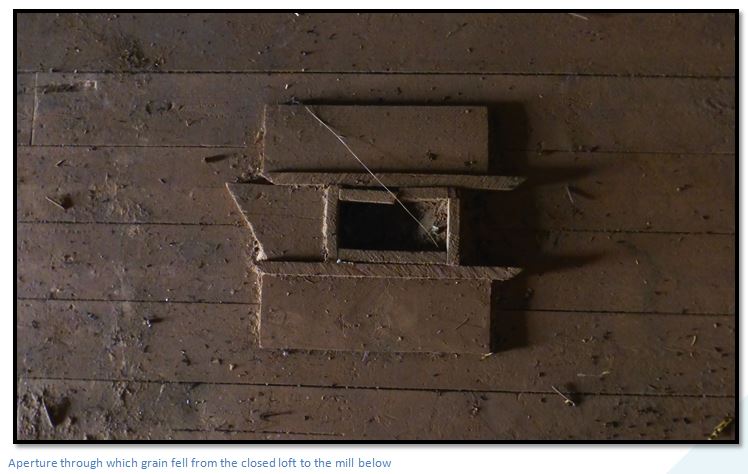 The loft is divided into two sections. The closed loft under the pitched roof was being used in the 1960’s as a carpenter’s shop, but the remains of a gantry indicate a different use originally, probably as the grain store. Into the floor of the closed loft are the remains of an aperture through which unmilled grain would have fallen from a hopper down to the mill below.