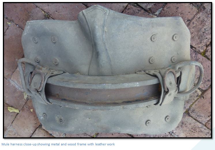 My attention was drawn during my first visit to two dusty mule harnesses lying in the loft. These have been collected and one each will be given to the Rhodes Nyanga Historical Exhibition and Mutare Museums which both collect items of early transport in Zimbabwe; both probably predate 1902 when the Zeederberg’s mule drawn coaching service ceased.