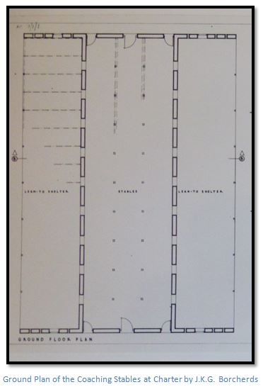 Borcherds did not think the existing roof lights were original as such a large expanse of glass would have been difficult to obtain around 1892 – 1894 and the hay-loft would have been sufficiently lighted with the loop-holes and two large doors, so they were probably added when the Coaching Stables were converted into a tobacco grading shed.